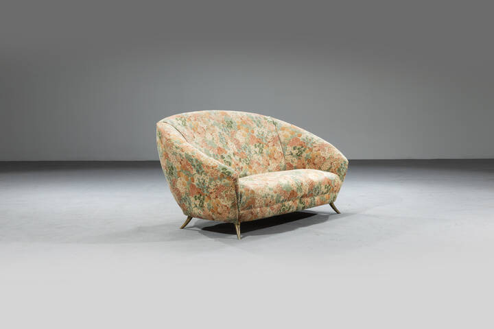 Struttura in legno, imbottittura rivestita in tessuto a fiori, gambe in ottone.
