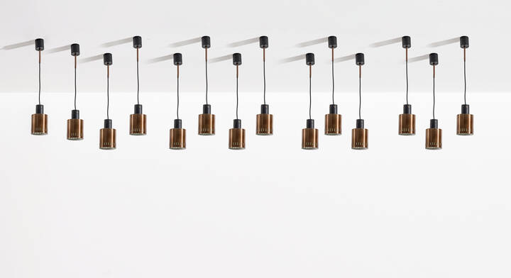 Quattrodici lampade a sospensione in metallo color rame e metallo verniciato.