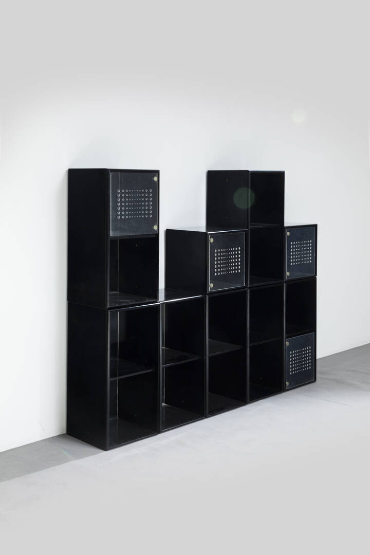 Legno laccato, plexiglass, vetro specchiato e particolari in metallo.