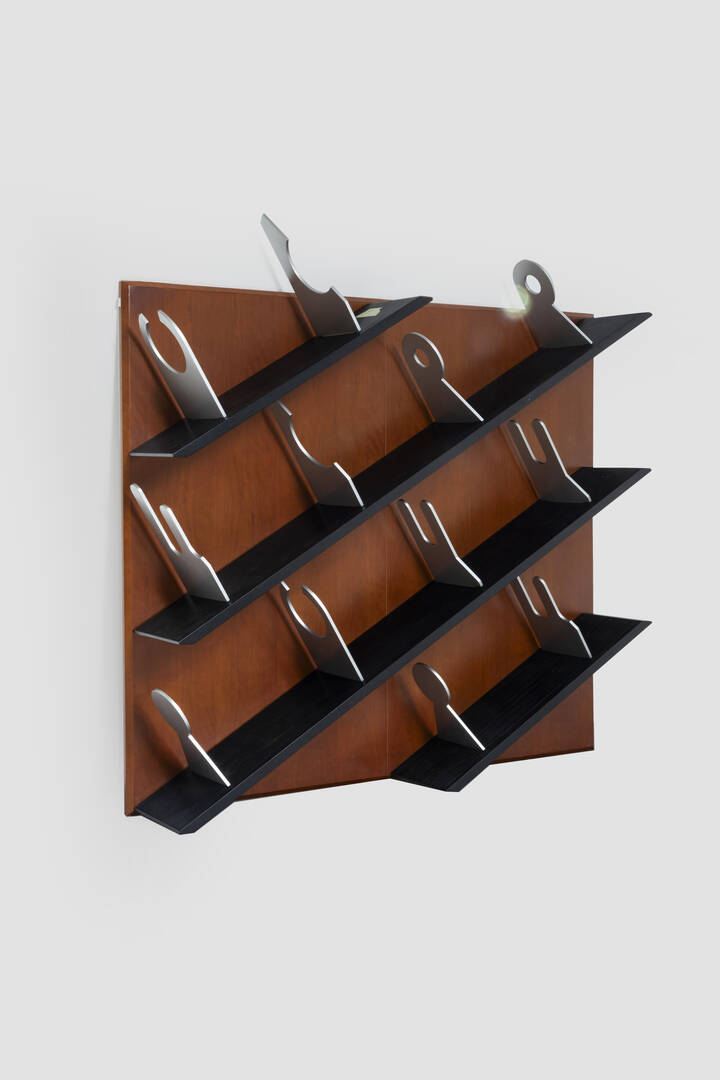 Struttura in legno, piani in legno verniciato e particolari a forme geometriche in legno laccato.