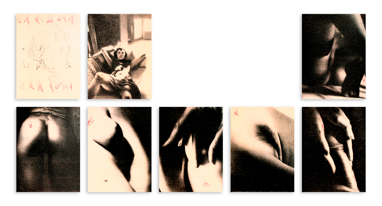 Cartella contenente testo di Giorgio Soavi e 8 litografie a 3 colori di Omar Galliani, ciascuna recante firma e numerazione (Esemplari 2/120) a matita al fronte