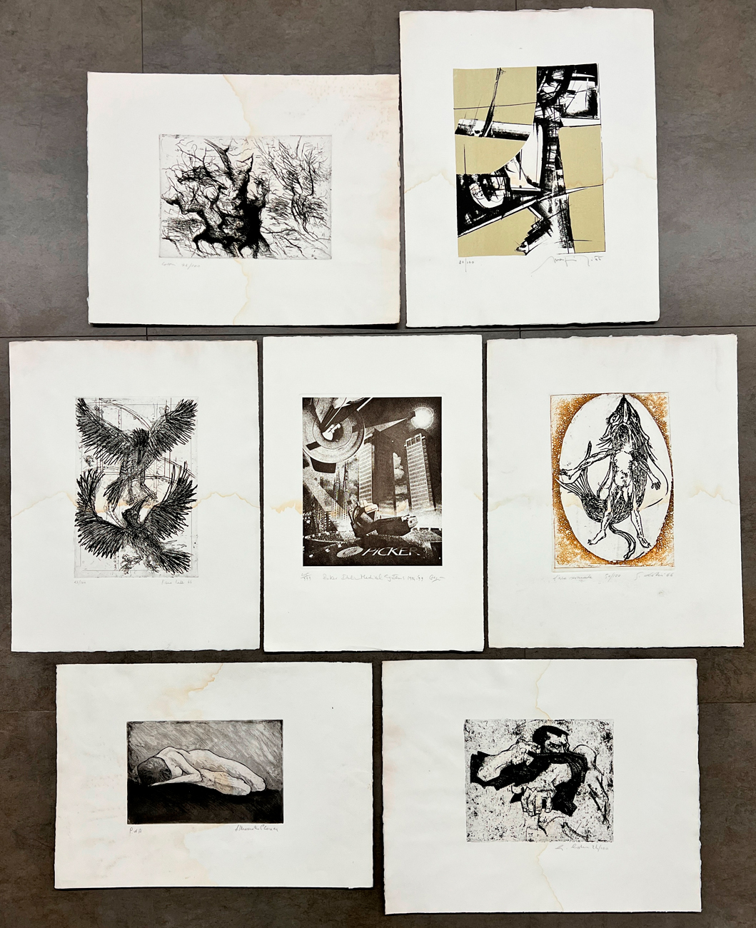 Lotto unico composto da 7 acqueforti, ciascuna recante firma e numerazione a matita al fronte (tra le firme indecifrate si segnala un'acquaforte di Piero Leddi)