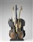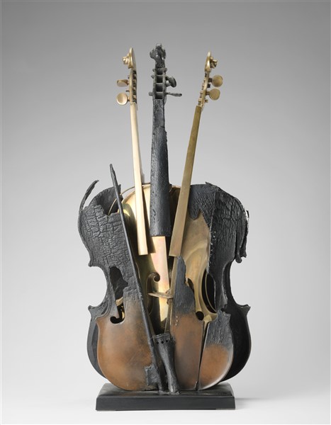 combustione di violino che racchiude un violino; bronzo dorato e patinato nero