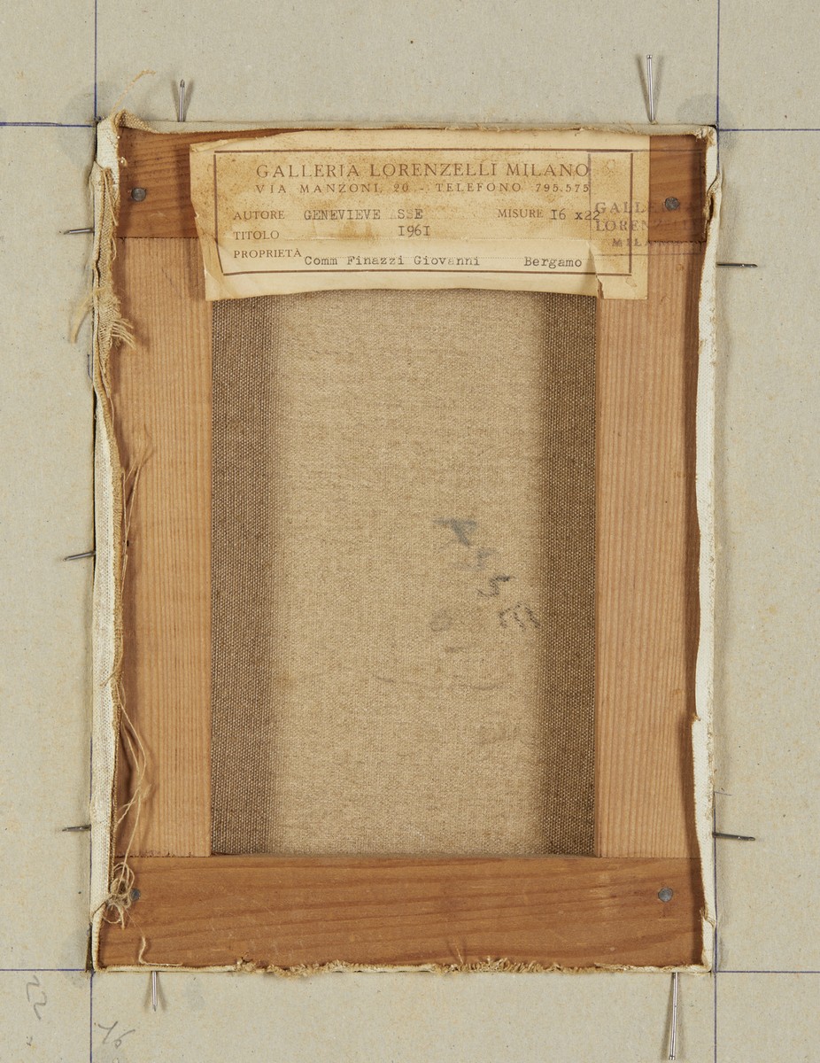 ASSE GENEVIEVE (1923 - 2021) SENZA TITOLO, 1961. Olio su tela. Cm 16,00 x 22,00. sul retro: firma e data; etichetta e timbro Galleria Lorenzelli, Milano