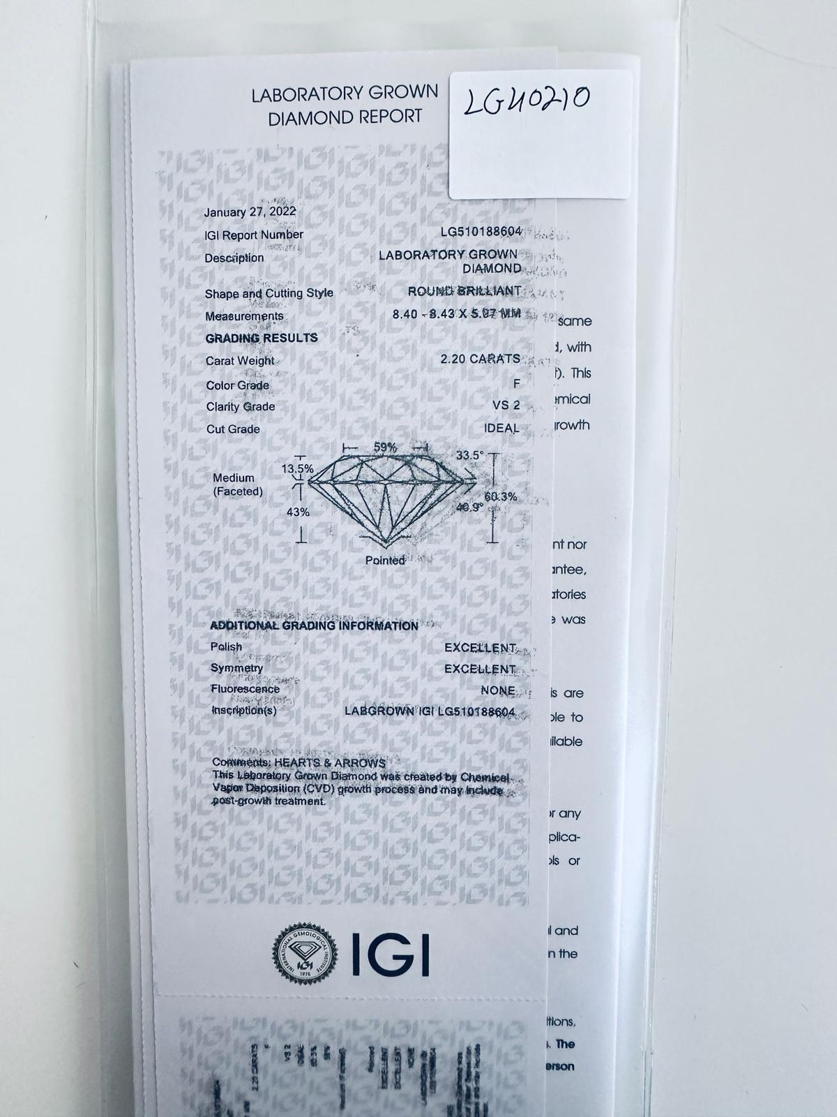 DIAMANTE 2,2 CARATI COLORE F - PUREZZA VS2 - TAGLIO BRILLANTE - LAB GROWN - CERTIFICATO IGI - LG40210