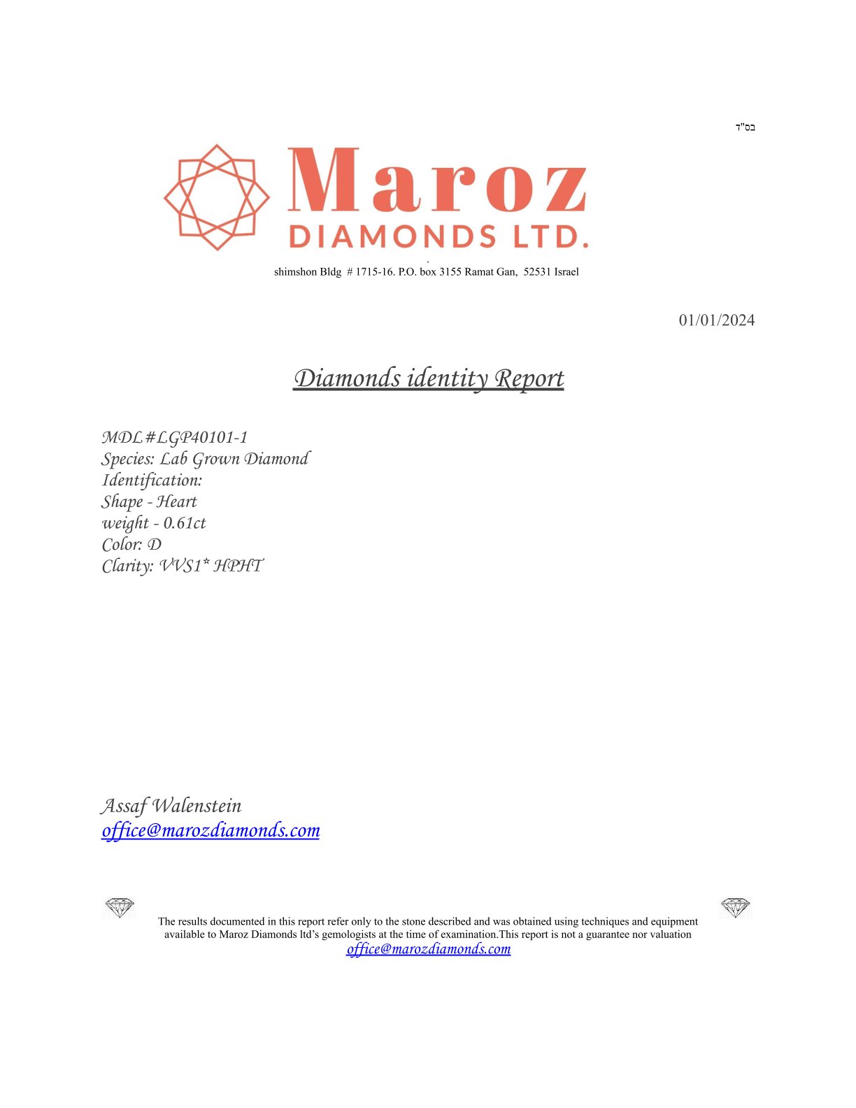 DIAMANTE 0,69 CARATI COLORE D - PUREZZA VVS1 - TAGLIO CUORE - LAB GROWN HPHT - CERTIFICATO GEMMOLOGICO MAROZ DIAMONDS LTD MEMBRO ISRAEL DIAMOND EXCHANGE - LGP40101-1