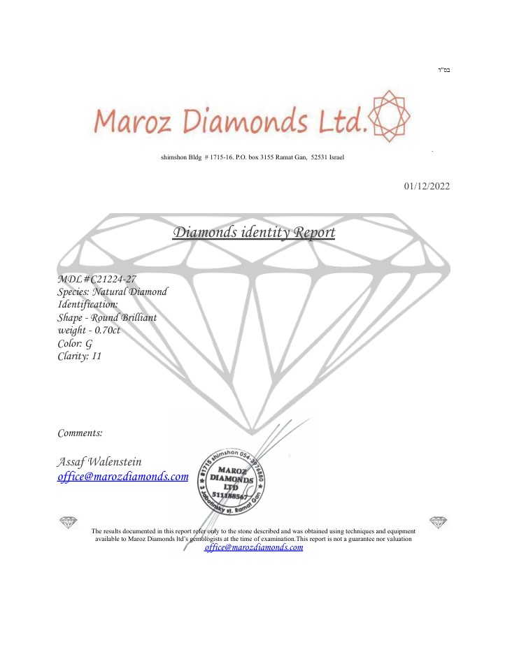 DIAMANTE NATURAL POLISHED 0,7 CARATI COLORE G - PUREZZA I1 - TAGLIO BRILLANTE - CERTIFICATO GEMMOLOGICO MAROZ DIAMONDS LTD MEMBRO ISRAEL DIAMOND EXCHANGE - C21224-27