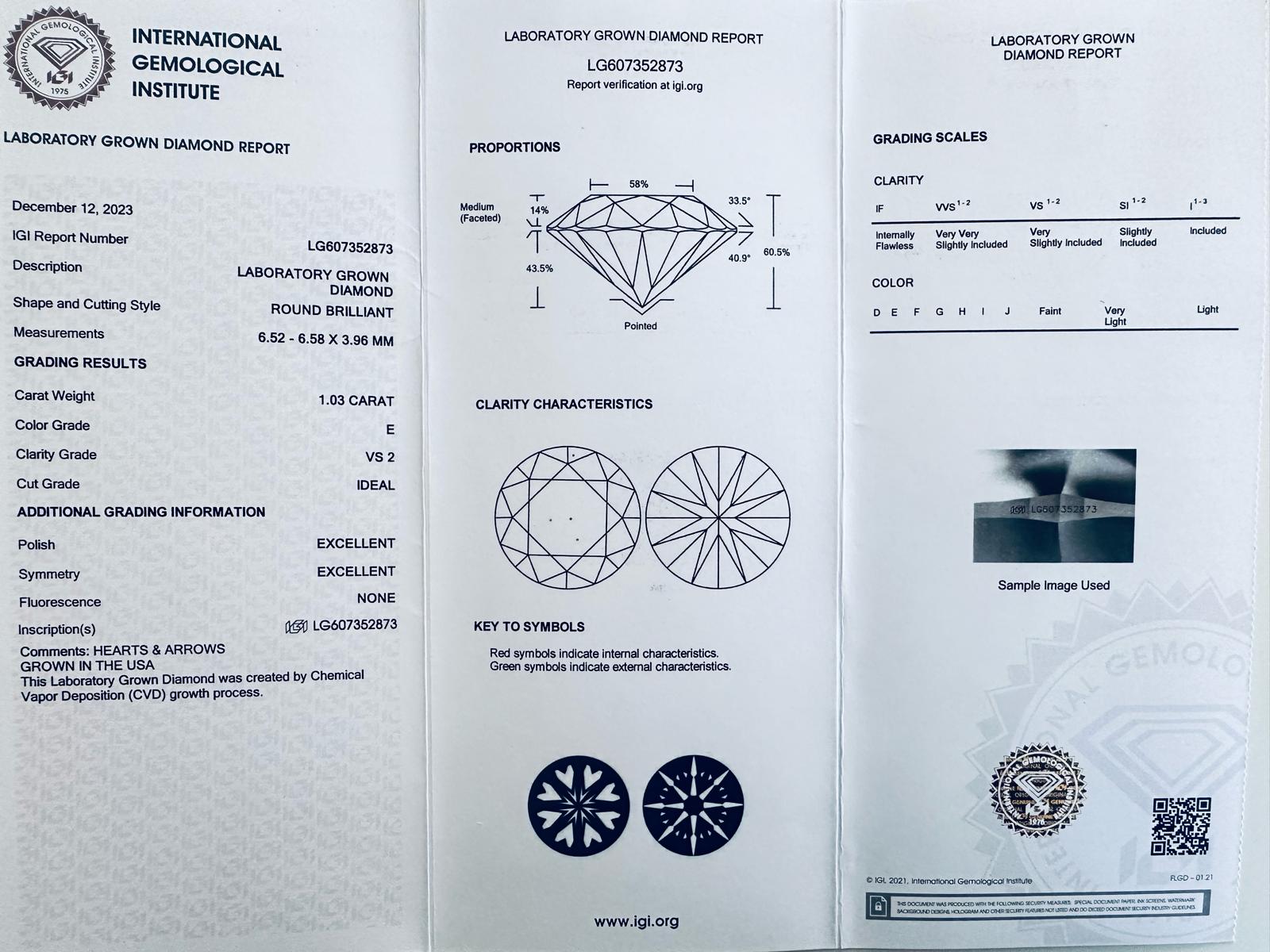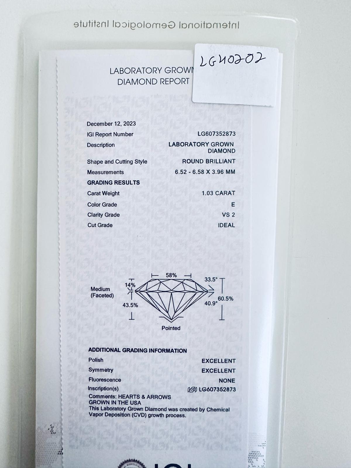 DIAMANTE 1,03 CARATI COLORE E - PUREZZA VS2 - TAGLIO BRILLANTE - LAB GROWN - CERTIFICATO IGI - LG40202
