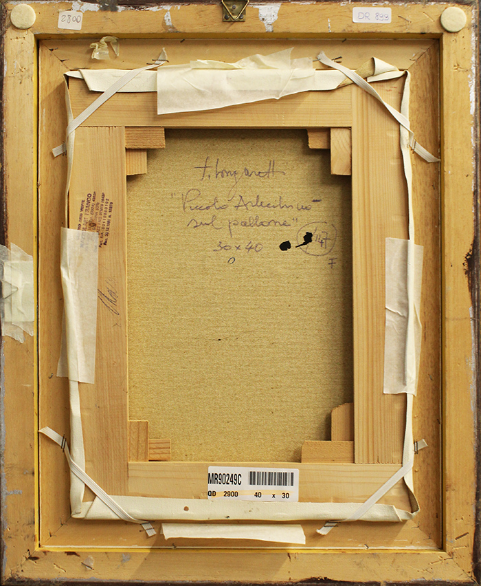 TRENTO LONGARETTI, "Piccolo arlecchino sul pallone", anni '80, Olio su tela, Dim. 40X30, Al fronte: firma in basso a sinistra, Al verso: firma, titolo, dimensione, Autentica su foto dell'artista. Opera con cornice.