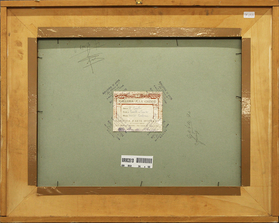GIUSEPPE CESETTI, "Quattro cavalli a pascolo", 6 aprile 1974, tecnica mista su cartone, dim 36x50. Al fronte: firma in basso a destra. Al verso: in alto a sinistra data e firma. Data e firma scritte anche di traverso a sinistra. Al centro: etichetta Galleria d'Arte La Chiave, Mestre: nome autore, titolo, misura, tecnica. Opera con cornice.