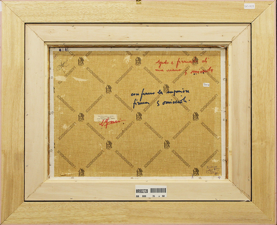 GIOVANNI OMICCIOLI, 1975, olio su tela, dim 35x50. Opera archiviata dall'Archivio G. Omiccioli al N°00072023 in data 16 aprile 2023, Roma a cura del Direttore Mauro Borgiani. Al fronte: firma in basso a sinistra. Al verso: dichiarazione di autenticità da parte dell'artista in alto a destra e al centro. Anno in basso a destra, a sinistra etichetta Centro d'Arte L.Pusso, Galleria L.Ancora, Roma. Opera con cornice.