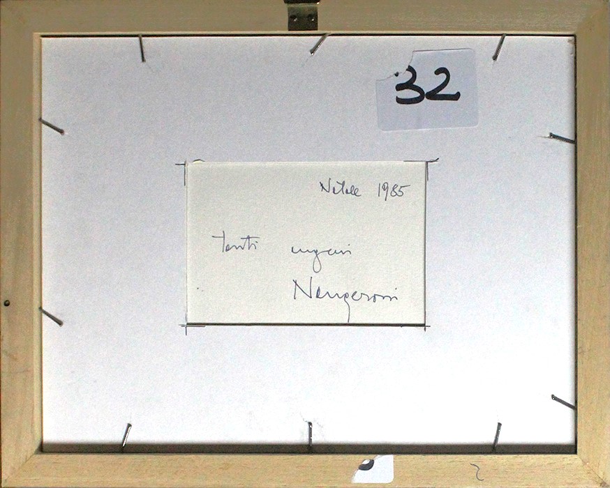 Carlo Nangeroni, Senza titolo, 1985, Tecnica mista su cartoncino, Dim. 10x15, Al verso: dedica, datato e firmato, Al fronte: datato e firmato in basso a sinistra. Opera con cornice.