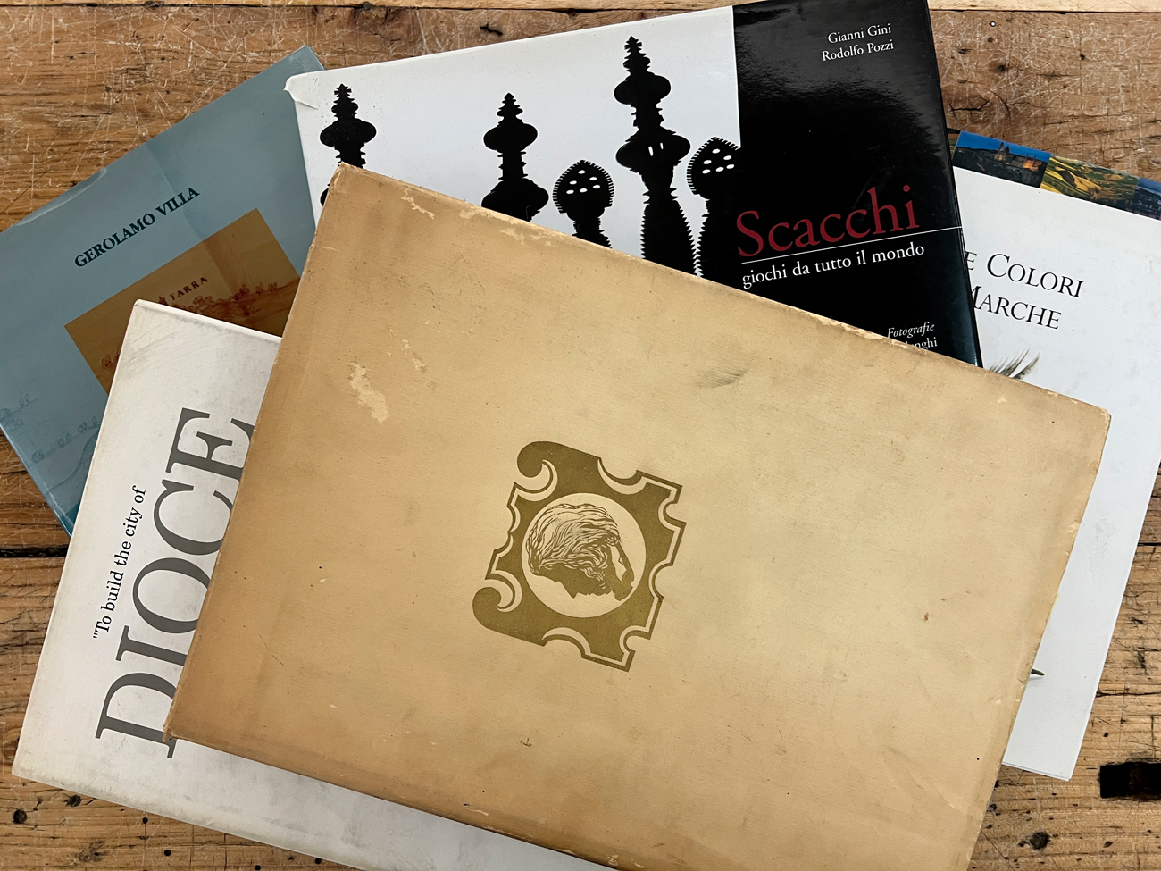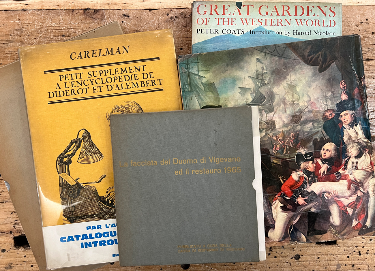 Lotto unico di cataloghi illustrati relativi a varie tematiche tra cui giardini, grandi battaglie navali, scacchi, sapori delle Marche, Fara d'Adda e oggetti introvabili