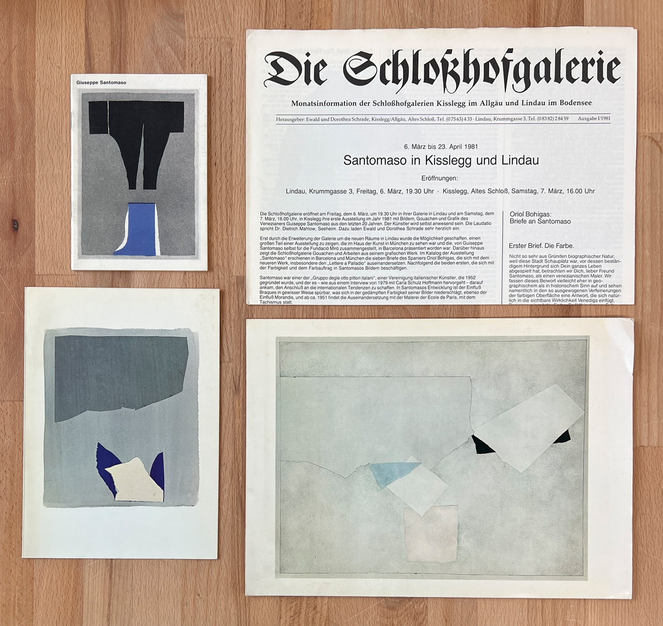 Si allegano 4 pieghevoli illustrati relativi a storiche esposizioni di Giuseppe Santomaso, tra cui una mostra tenutasi presso Olivetti, Ivrea, nel 1980