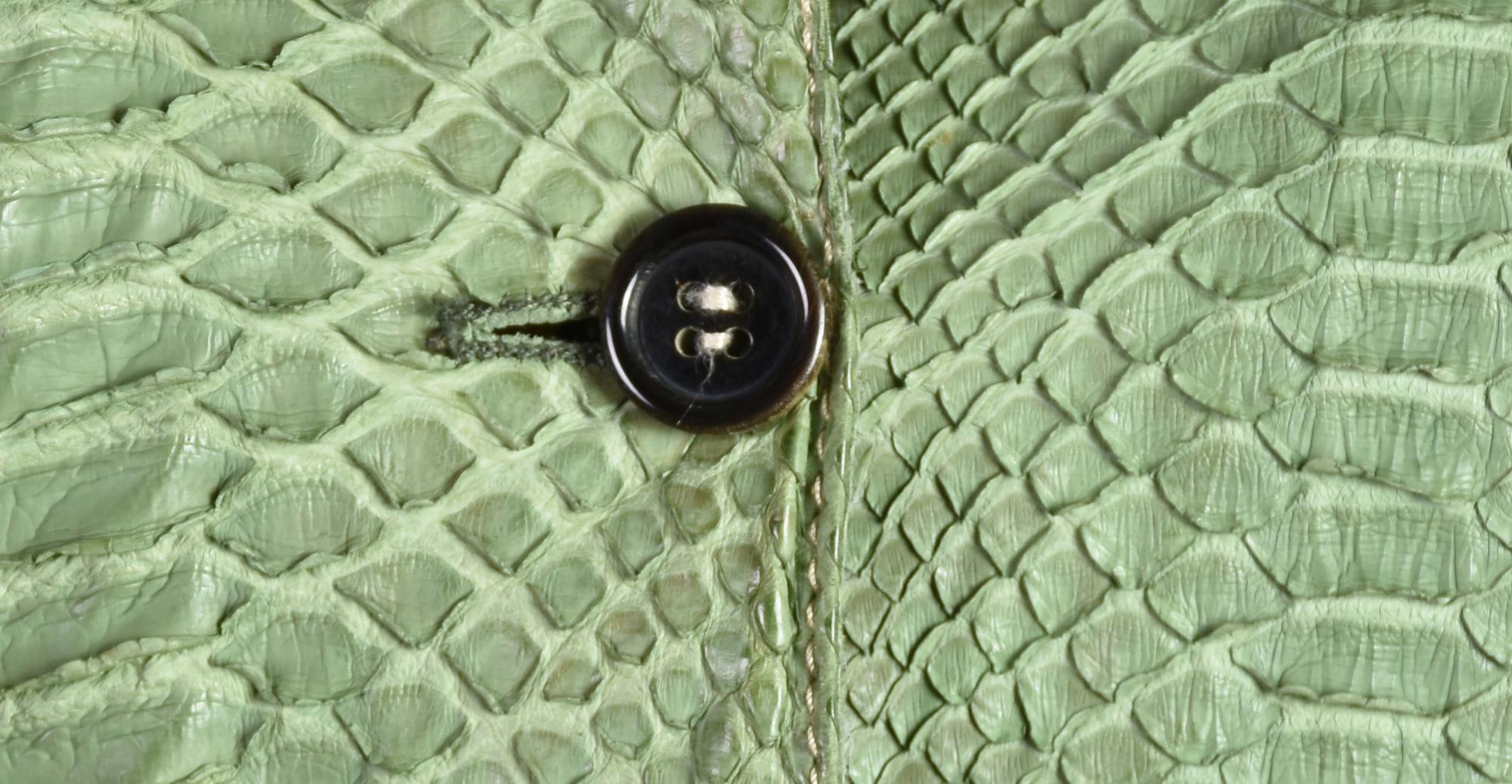 Giacca corta in pitone verde a due bottoni con due tasche frontali. Taglia L ma veste una M. Prodotto in Italia. Segni d'uso e del tempo. Ben conservata.