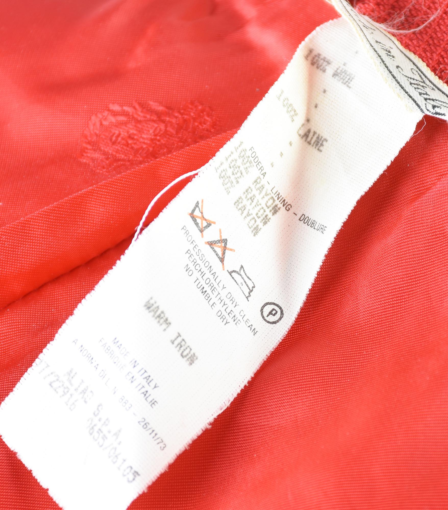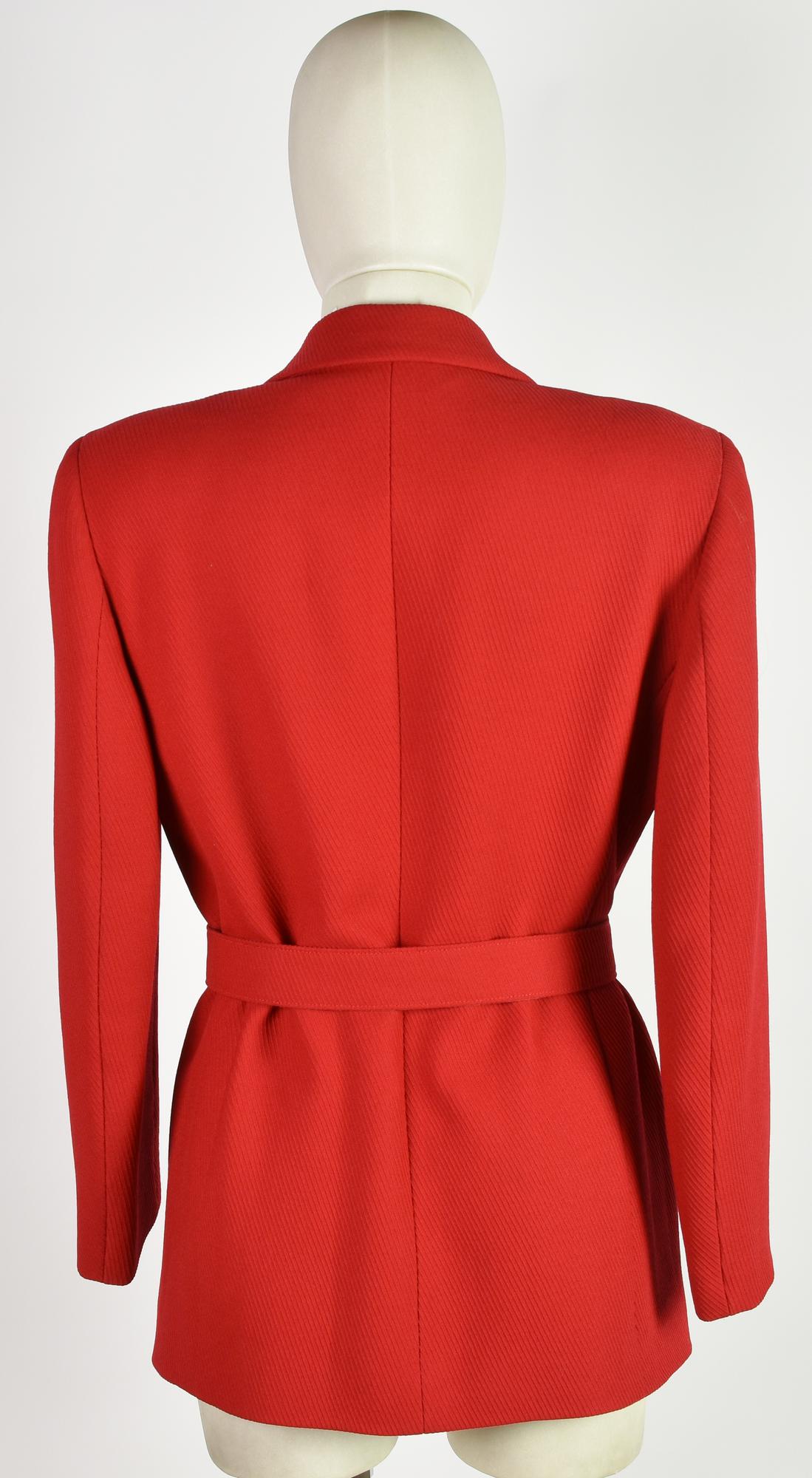 Women's red blazer with belt. Features concealed button and padded shoulders. 100% wool. Size 42 IT. Made in Italy. Perfectly preserved.
