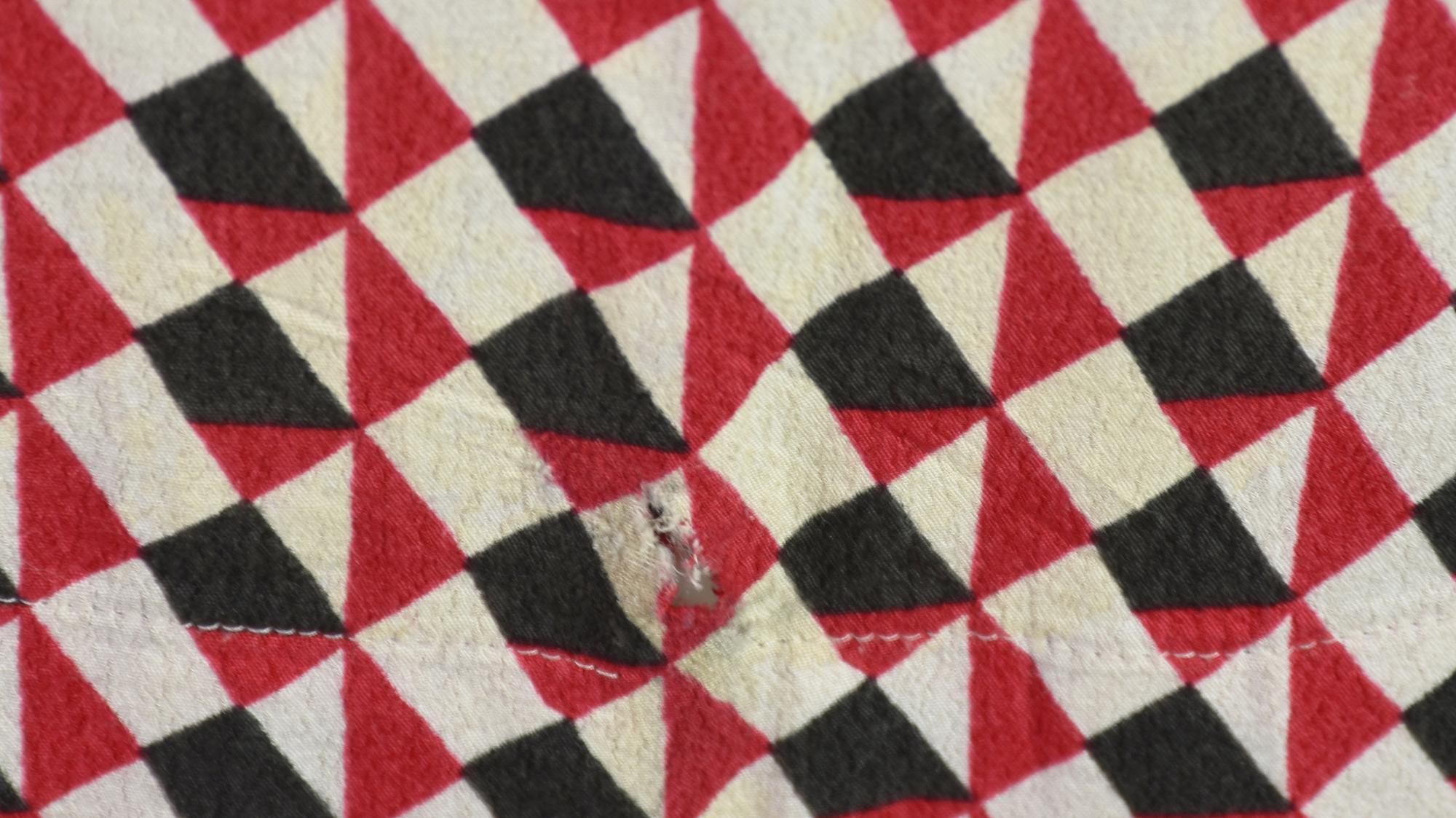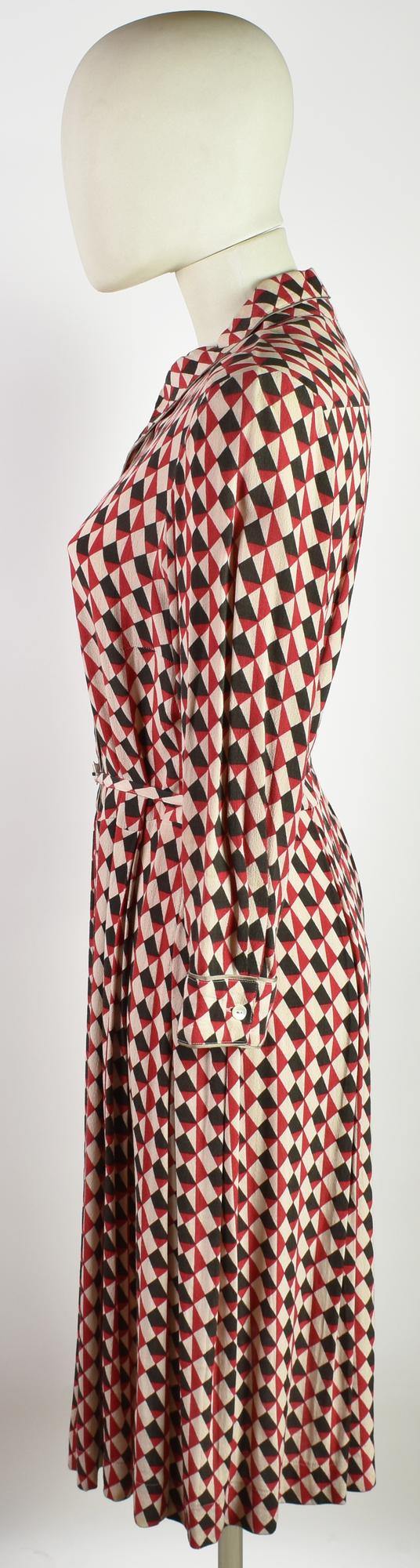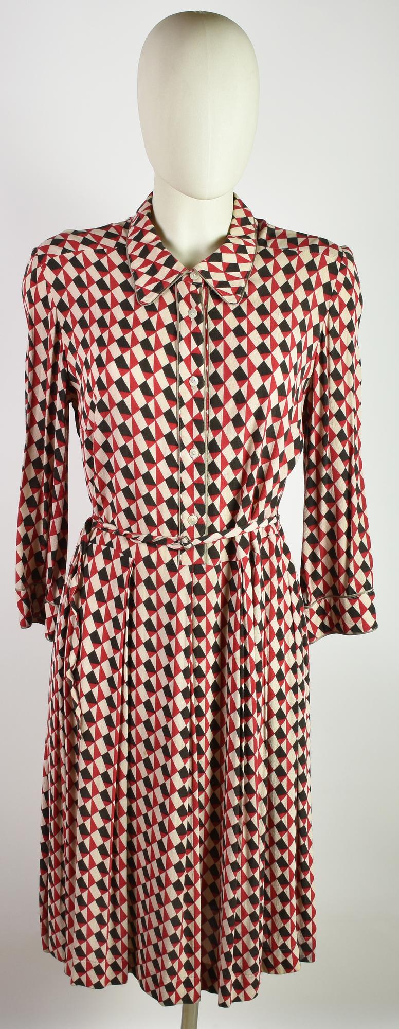 Abito chemisier, in cady stampa geometrica beige, rossa e nera. Cerniera sul fianco. Taglia 42/44 IT. Produzione primi anni 2000. Ben conservato.