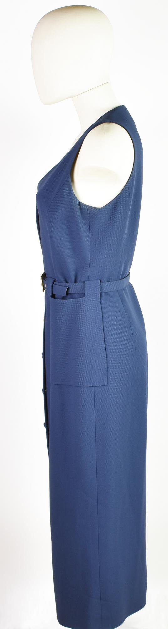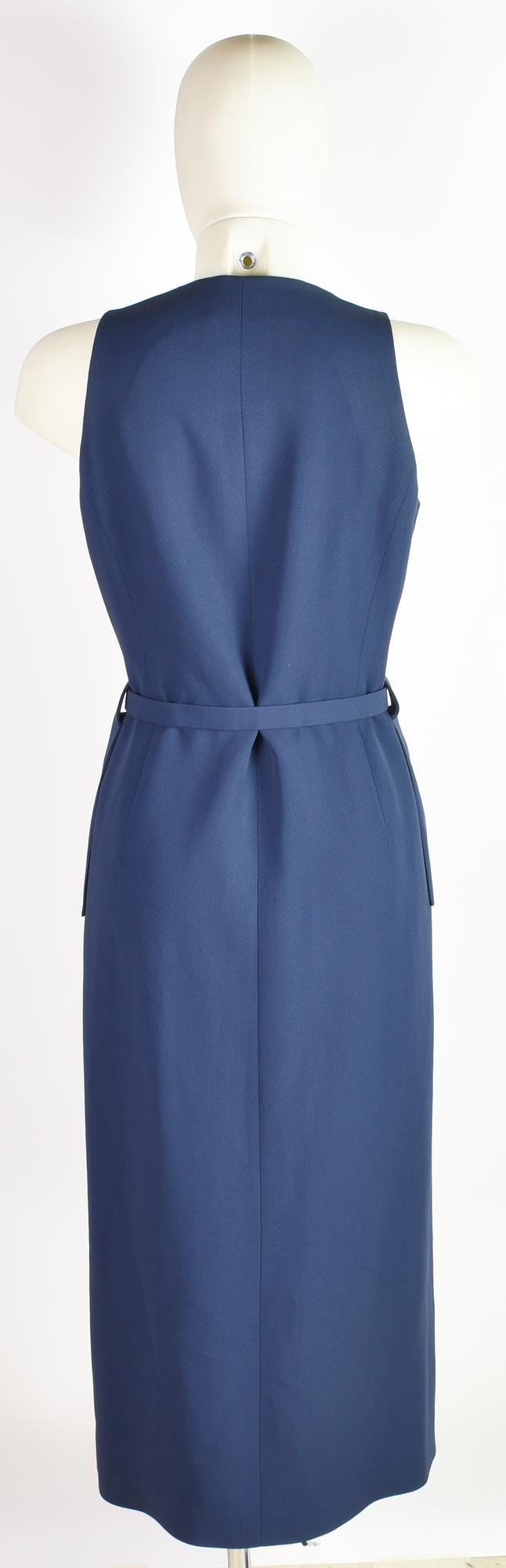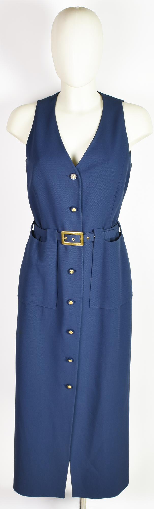 Abito chemisier blu navy con cintura in vita. Presenta due tasche laterali e bottoni con il logo della Maison. Taglia 40 FR. Prodotto in Francia. Qualche piccolo alone non compromette le ottime condizioni generali. Ben conservato.
