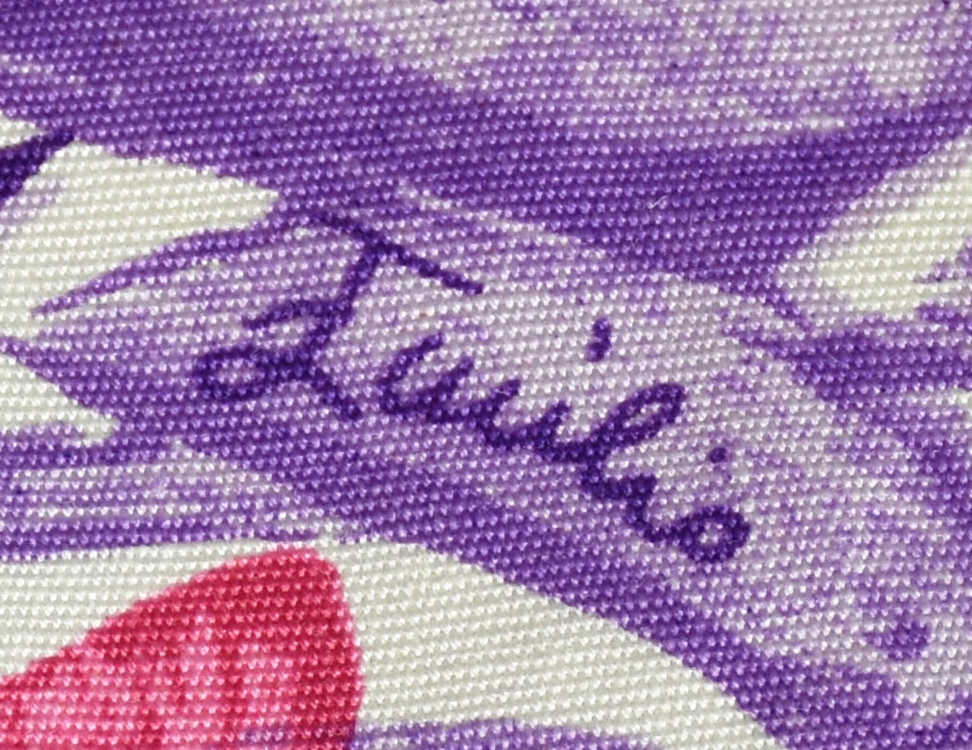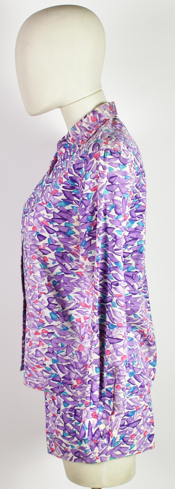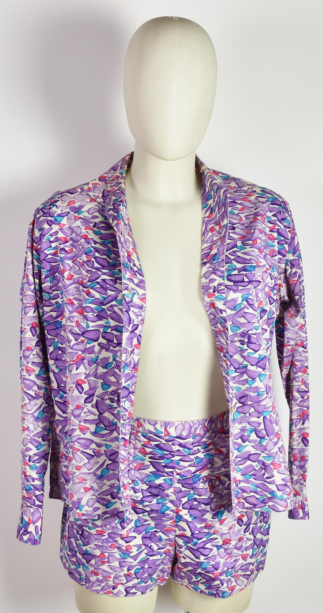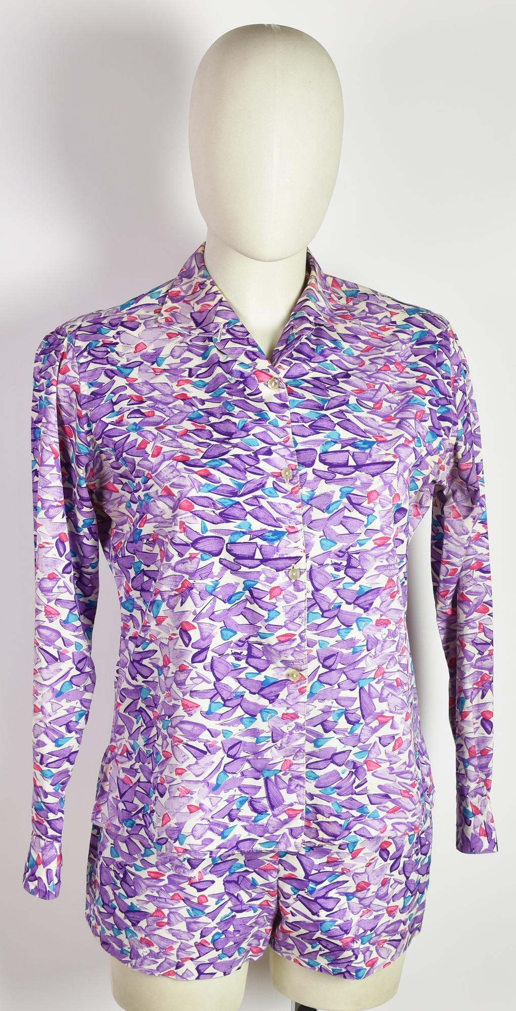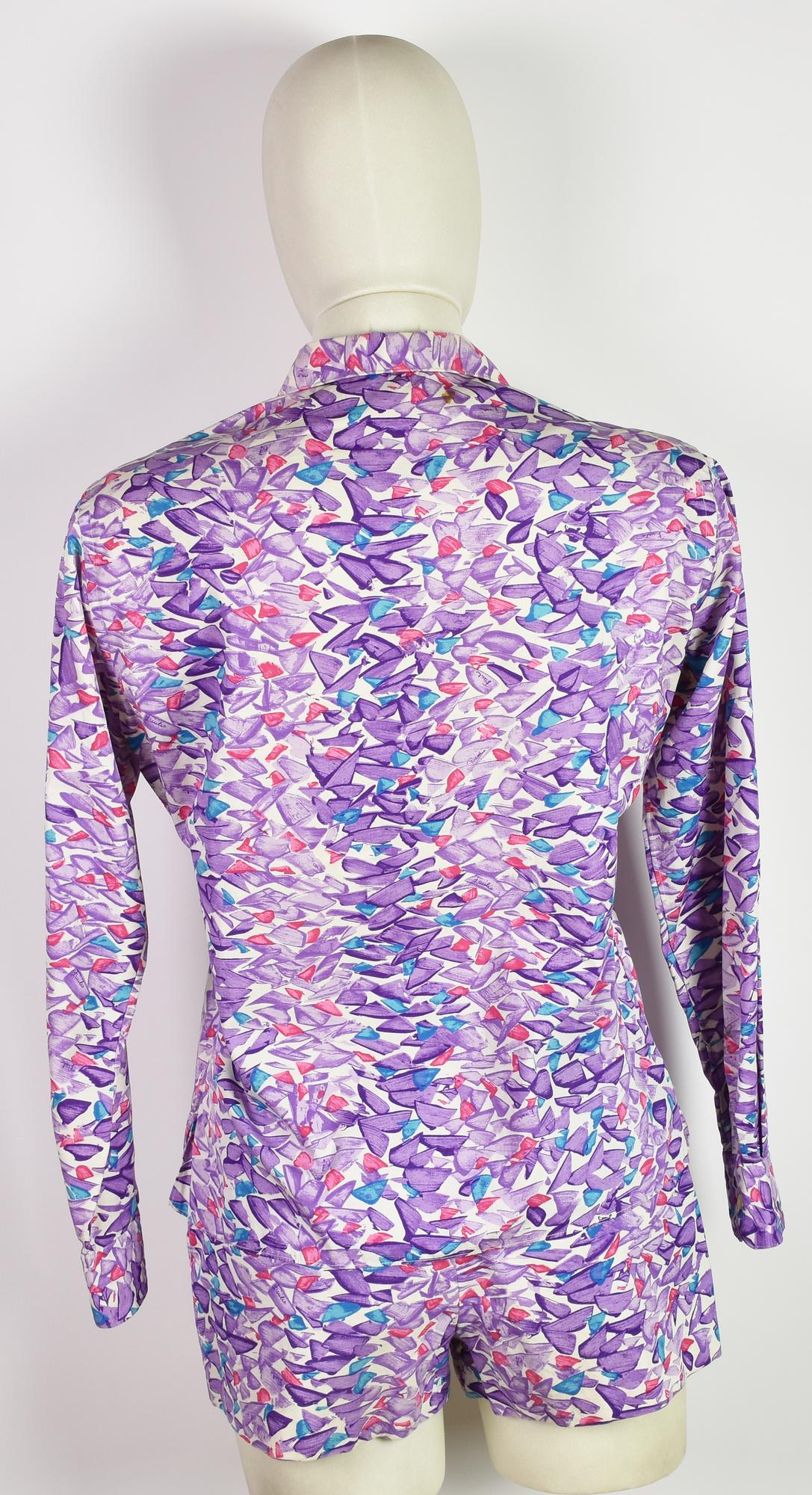 Capri suit 'Emilio Pucci Florence Italy' shirt and shorts. Abstract print in shades of blue, purple and pink. The inside collar of the shirt is a little yellowed and there are some stains. Size 42 IT. '60s. Made in Italy. Fairly well preserved.