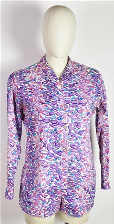 Completo Capri 'Emilio Pucci Florence Italy' composto da camicia e calzoncino. Stampa astratta nei toni del blu, viola e rosa. Un po' ingiallito l'interno collo della camicia e varie macchie. Taglia 42 IT. Anni '60. Prodotto in Italia. Discretamente conservato.