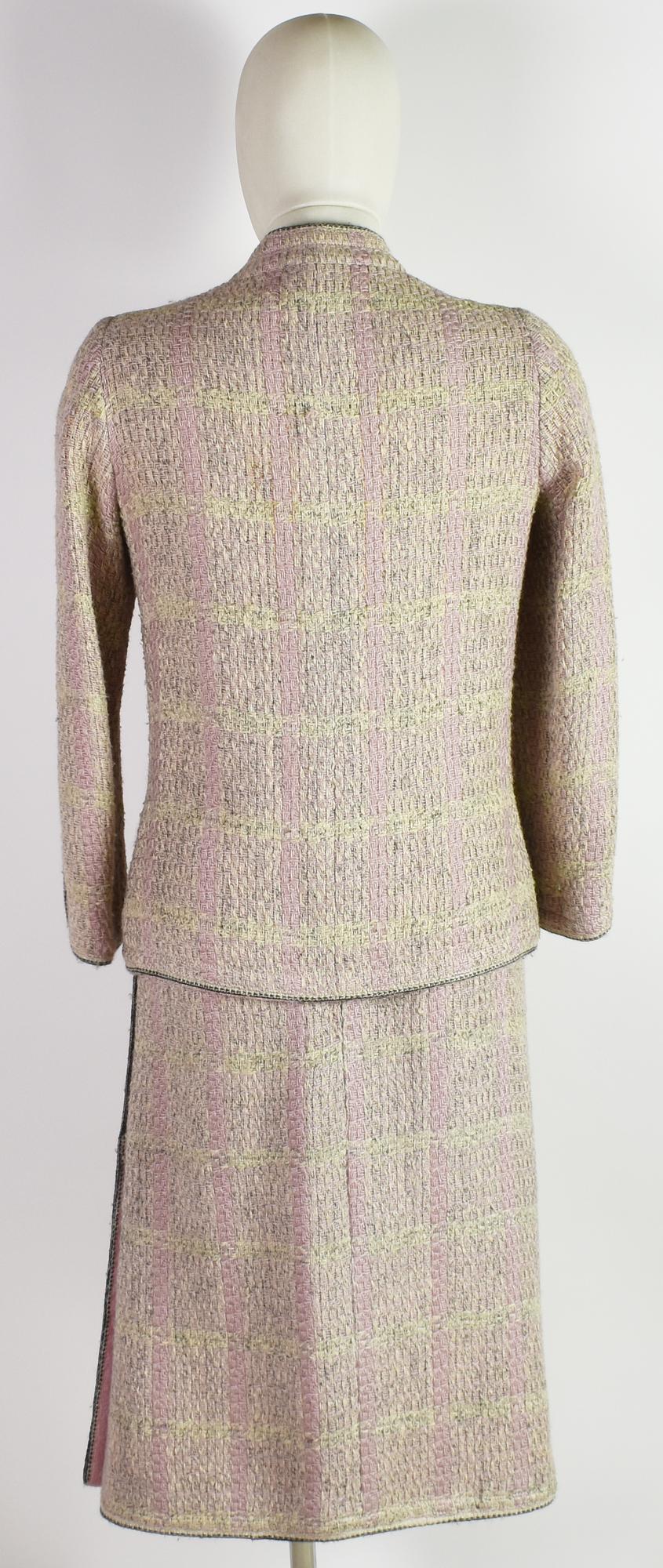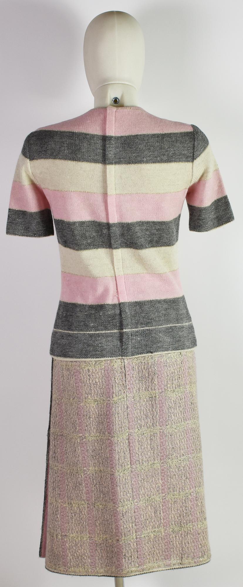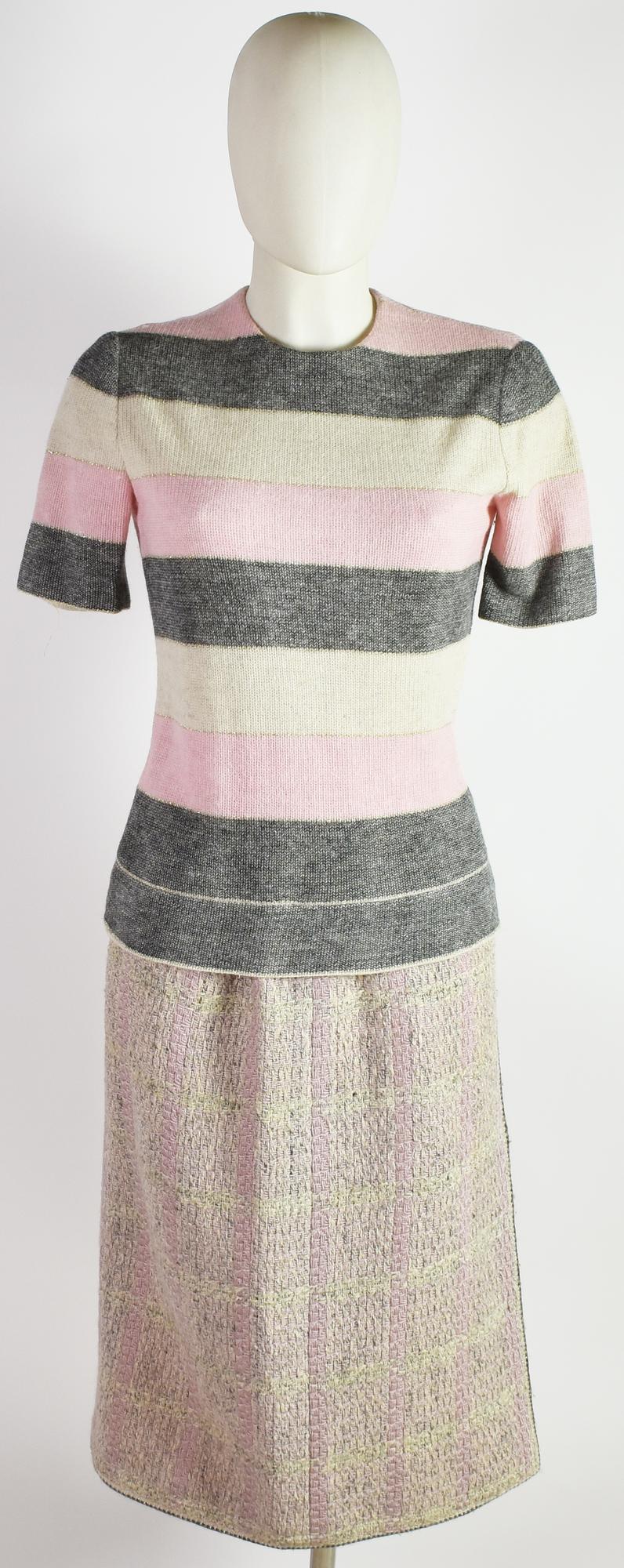 Historic 3-piece suit: jacket, skirt and striped half-sleeved cashmere sweater. Inside lining very stained. Missing button on one sleeve. Skirt widened from 42 to 44 IT. Number: 33508. Made in France in the 1960s. Fairly well preserved.
