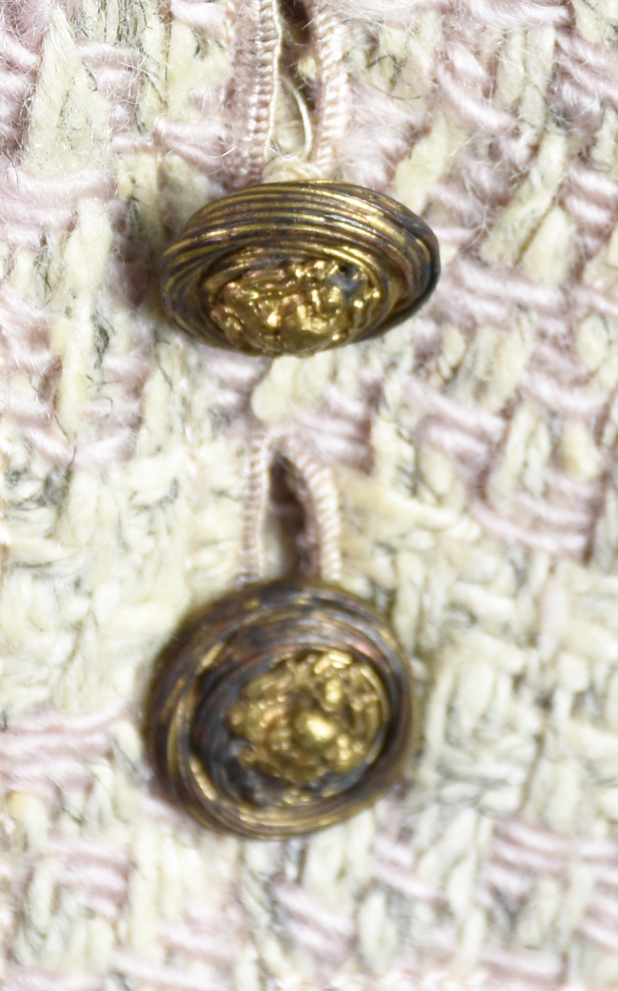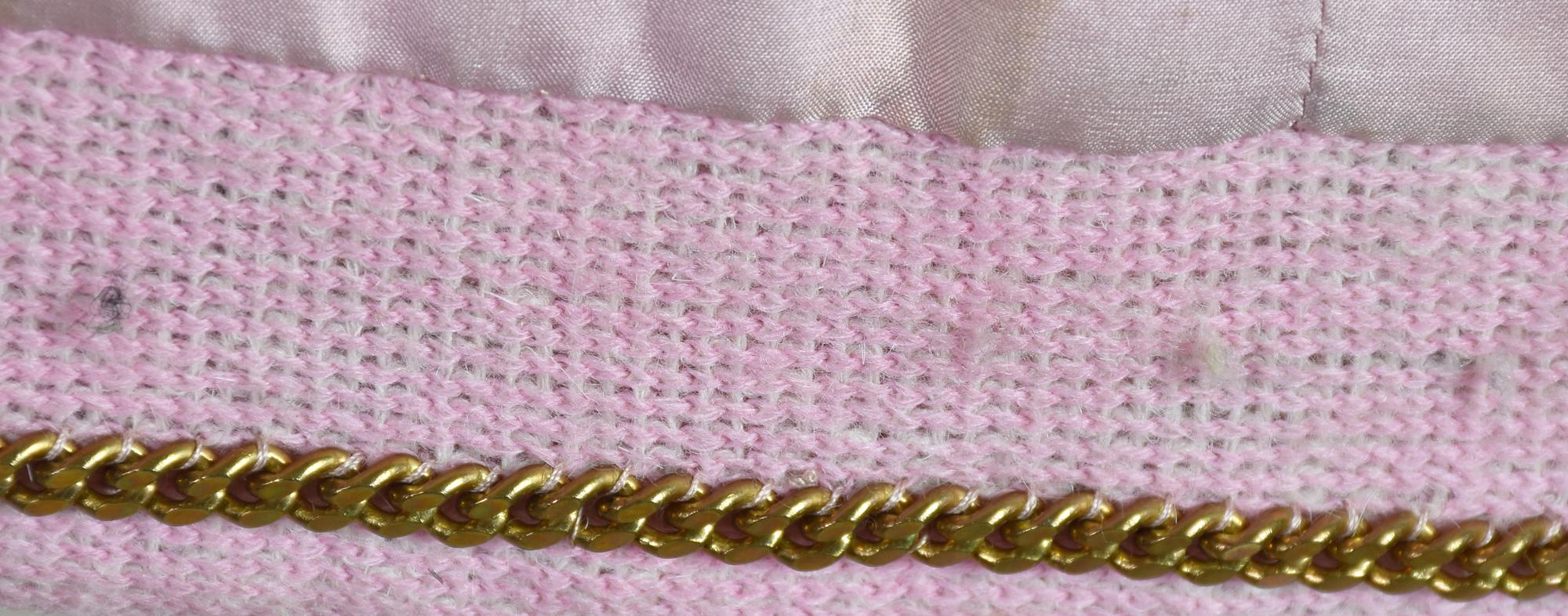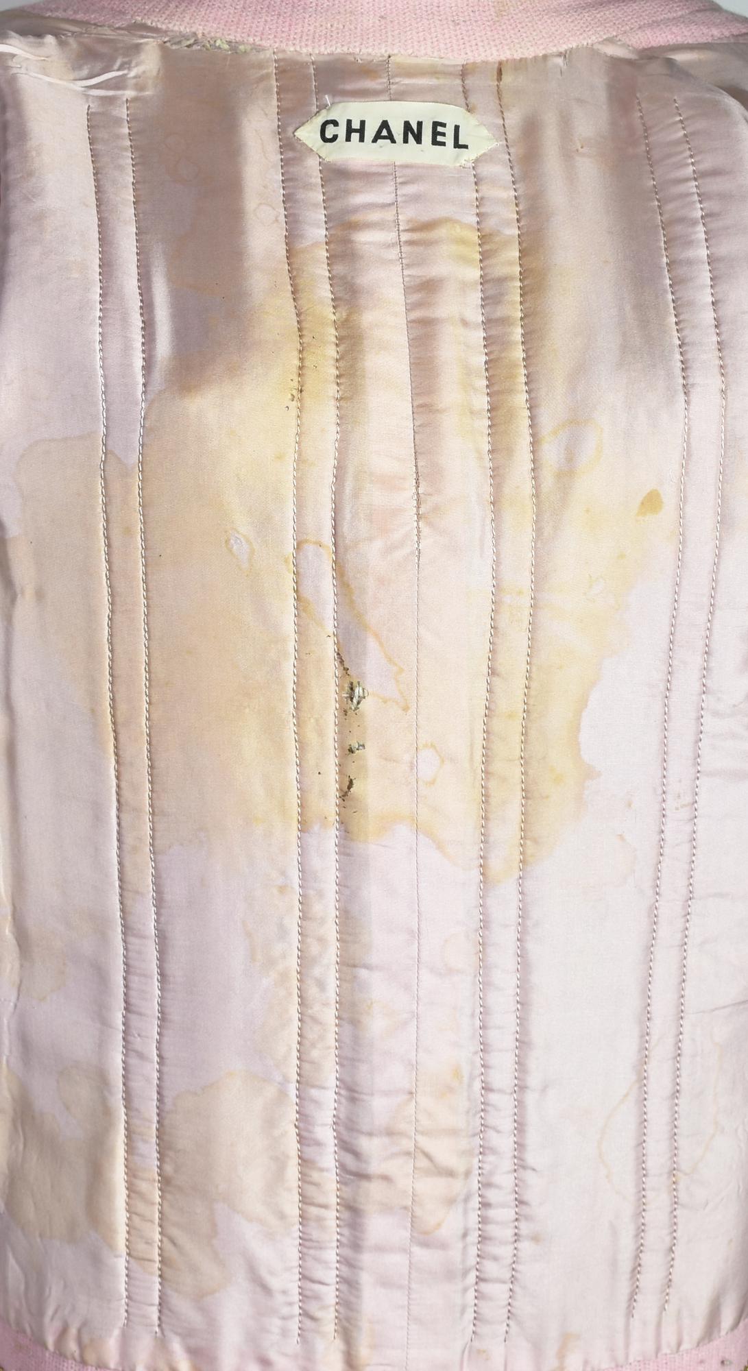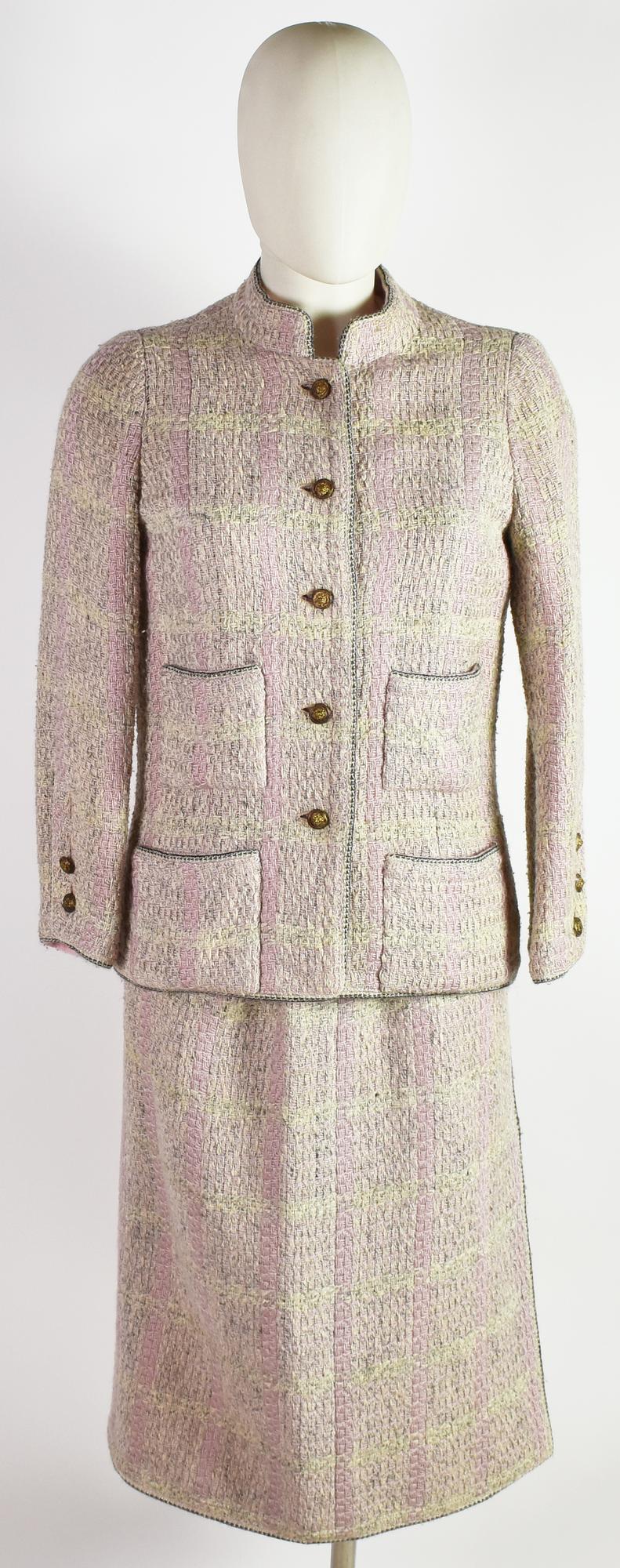 Historic 3-piece suit: jacket, skirt and striped half-sleeved cashmere sweater. Inside lining very stained. Missing button on one sleeve. Skirt widened from 42 to 44 IT. Number: 33508. Made in France in the 1960s. Fairly well preserved.