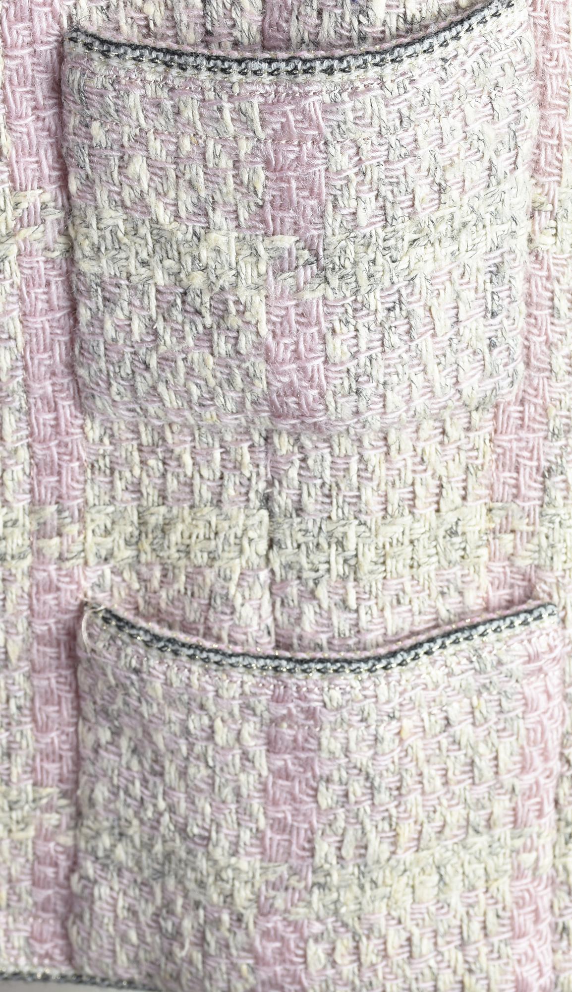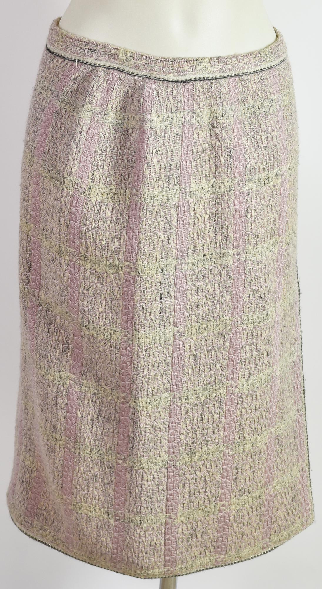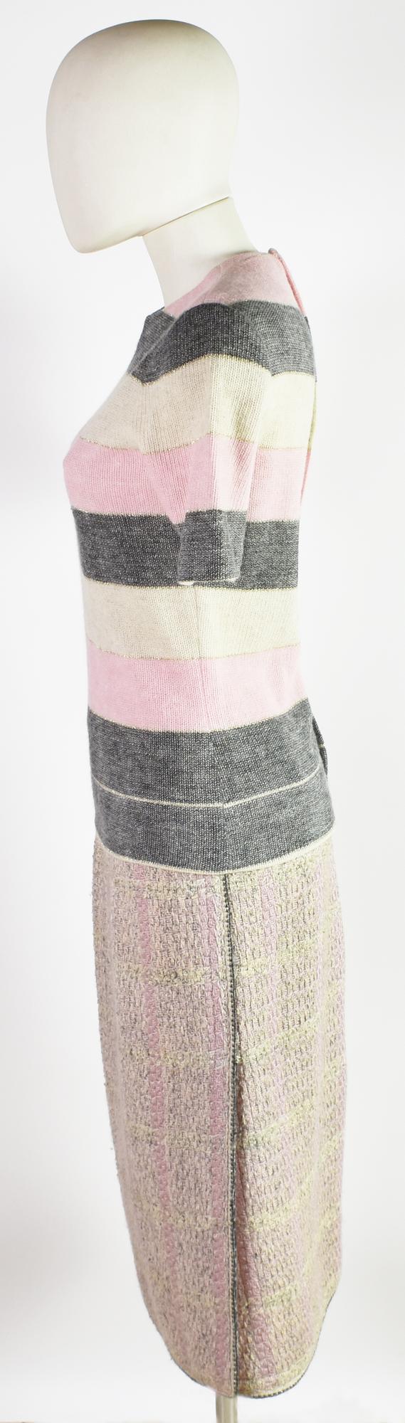 Storico tailleur tre pezzi: giacca, gonna e maglia di cashmere mezza manica a righe. Fodera interna molto macchiata con mancanze. Bottone mancante su una manica. gonna allargata da 42 a 44 IT.