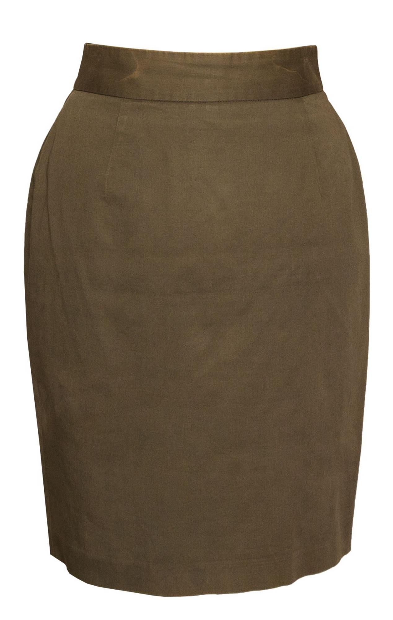 Changing green lined cotton suit. Jacket with wide neckline and skirt with center back slit, length cm 55 including the waist bend. Size IT 42 Made in Italy in the 90s. There are variations in the background color in various points visible by enlarging the photo. Well preserved.