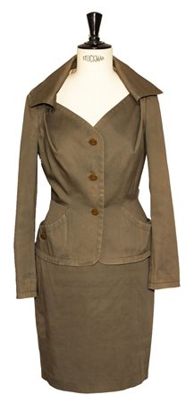 Completo in cotone color verde cangiante, foderato. Giacca con ampio scollo e gonna con spacco centro dietro, lunghezza cm 55 compreso il cinturino. Taglia IT 42. Made in Italy. Anni '90. Sono presenti delle variazioni di colore de fondo in diversi punti visibili ingrandendo la foto. Ben conservato.