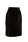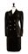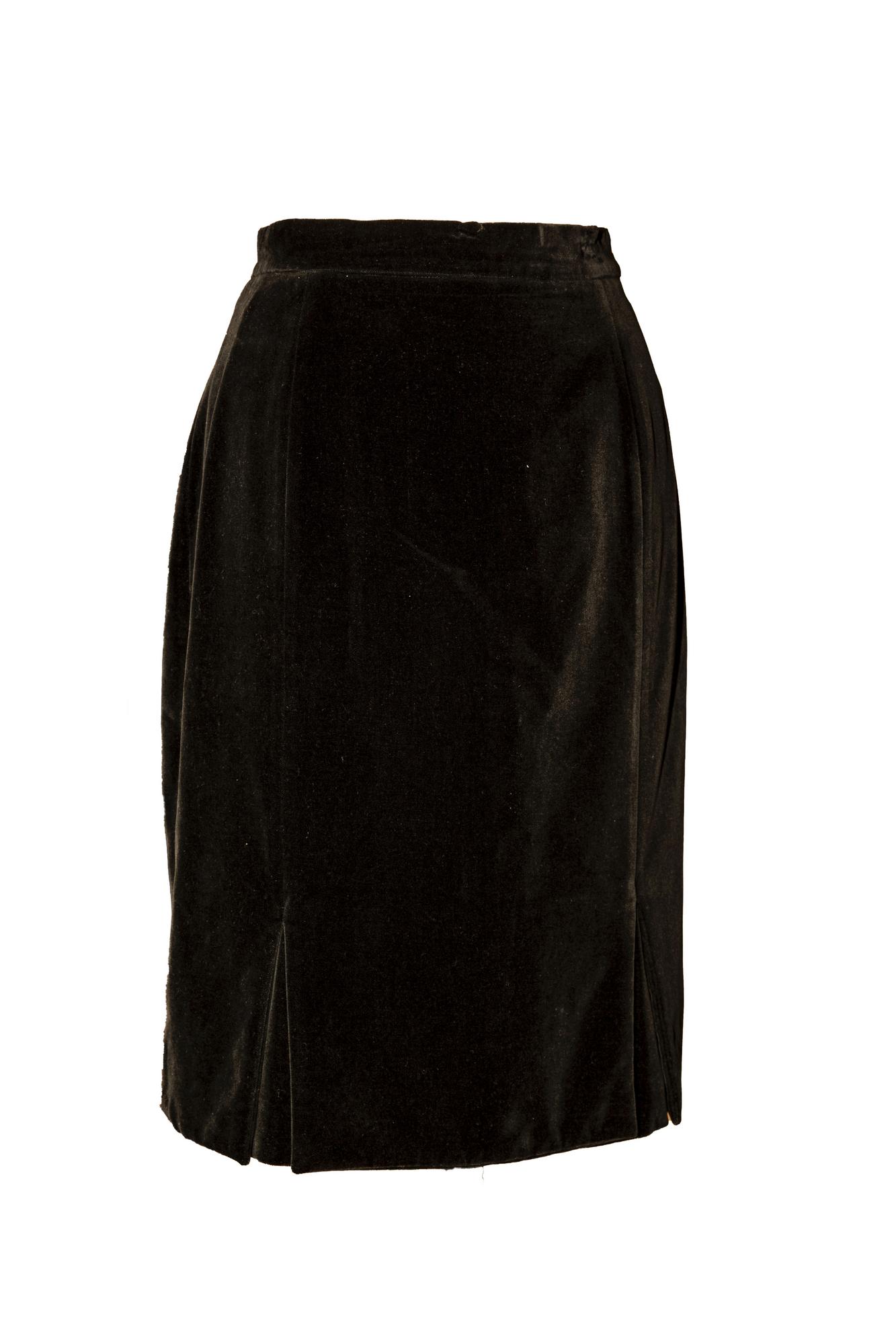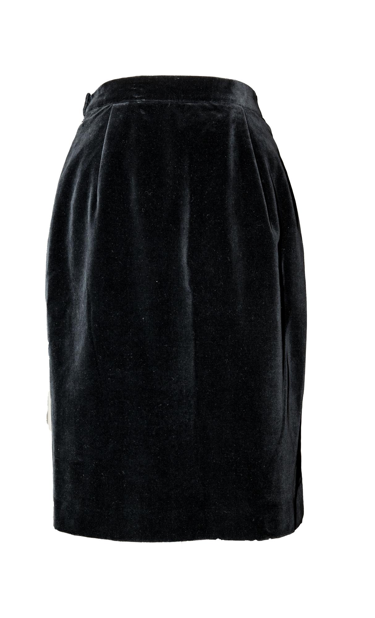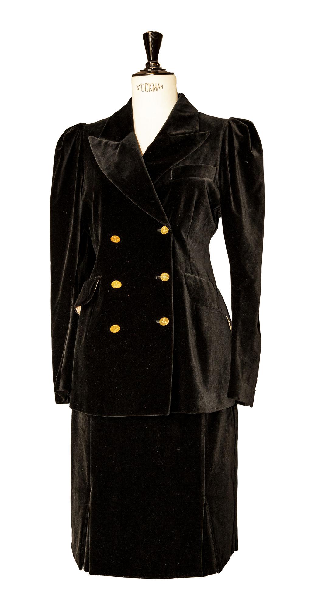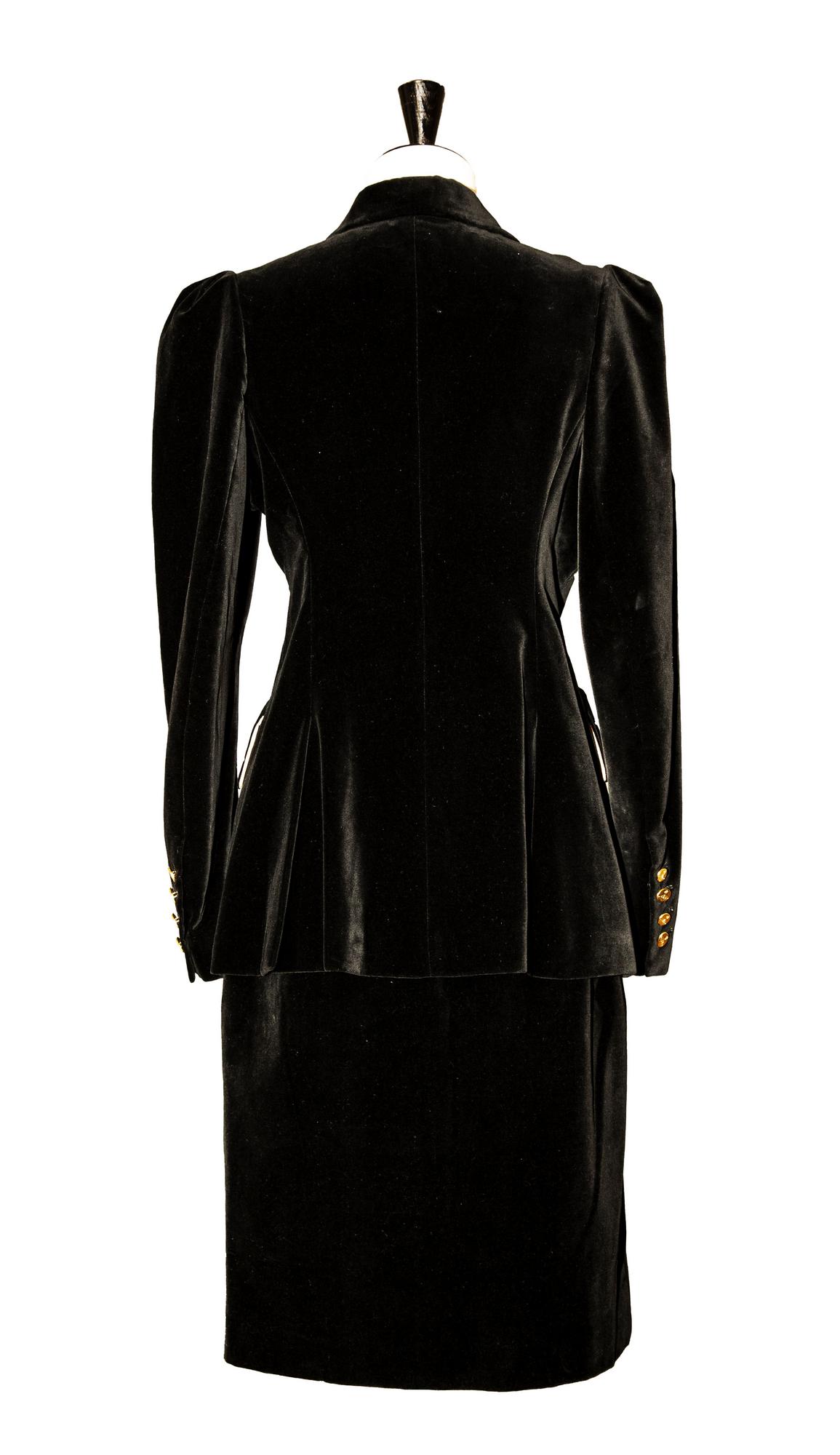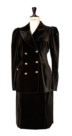 Completo in velluto di cotone nero foderato, composto da giacca a doppio petto, spalle importanti e tasche. La gonna ha due spacchi davanti e si allaccia sul fianco. Bottoni con logo in ottone finitura oro. Made in Italy nel 1995. TG IT 44. Perfettamente conservato.