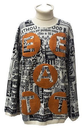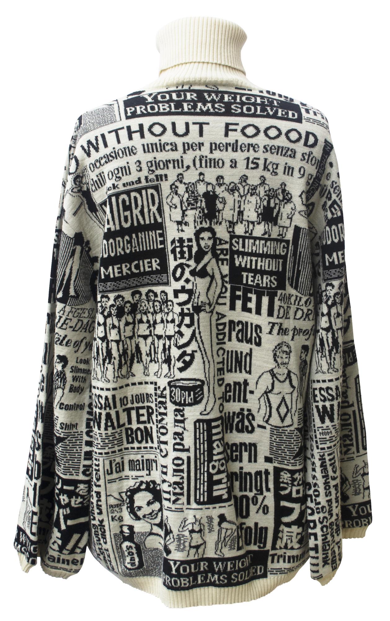 Maglione oversize a collo alto in lana. Art writing 'Diet' nella lavorazione jacquard di maglieria. Prodotto in Italia negli anni '80. Taglia L. Perfettamente conservato.