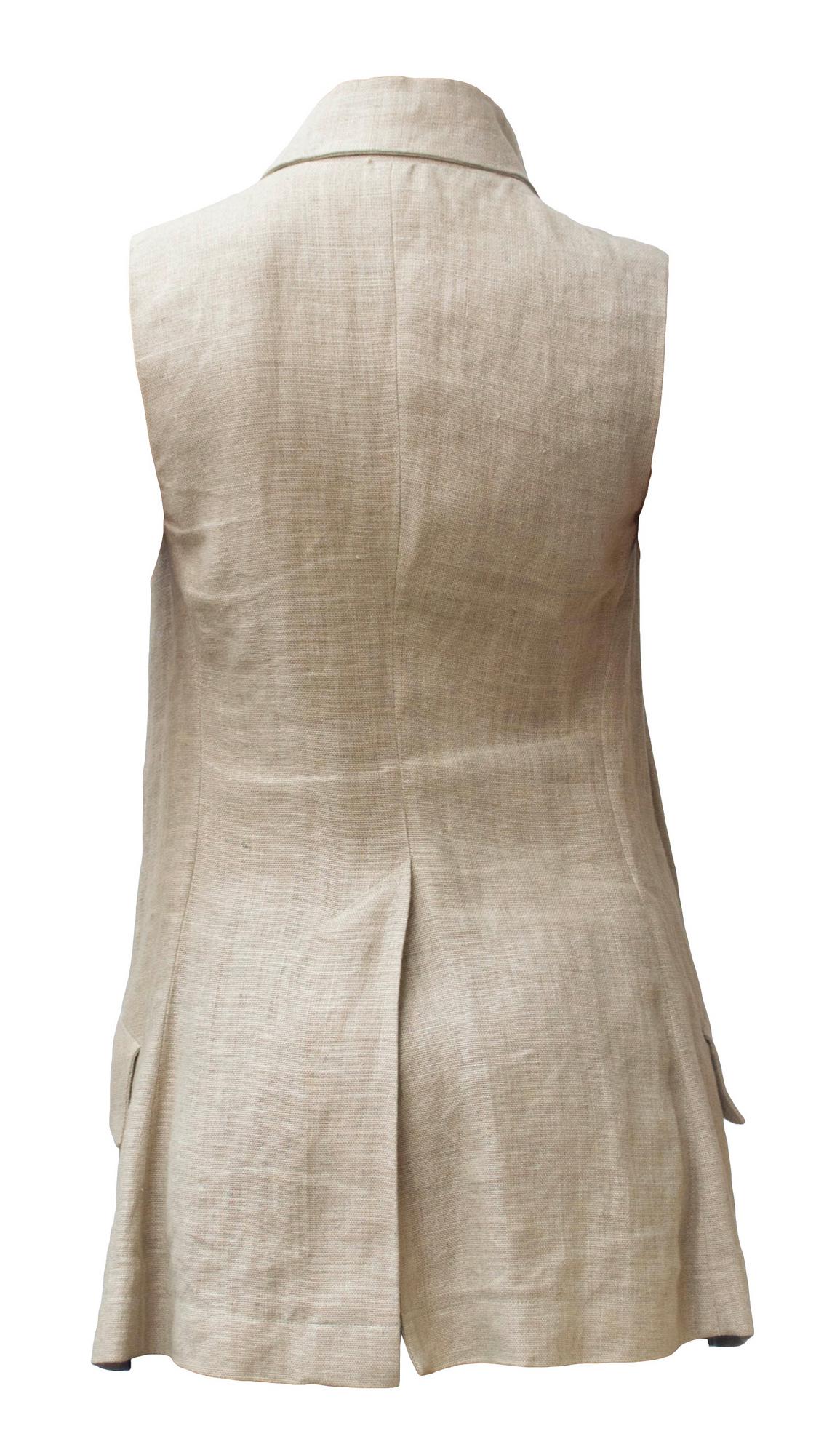 Gilet lungo semi foderato realizzato in lino colore naturale tasche e ampio collo con reverse. Spacco nel centro dietro. Si porta slacciato e aperto. Made in Italy negli anni '90. Taglia 42. Perfettamente conservato.