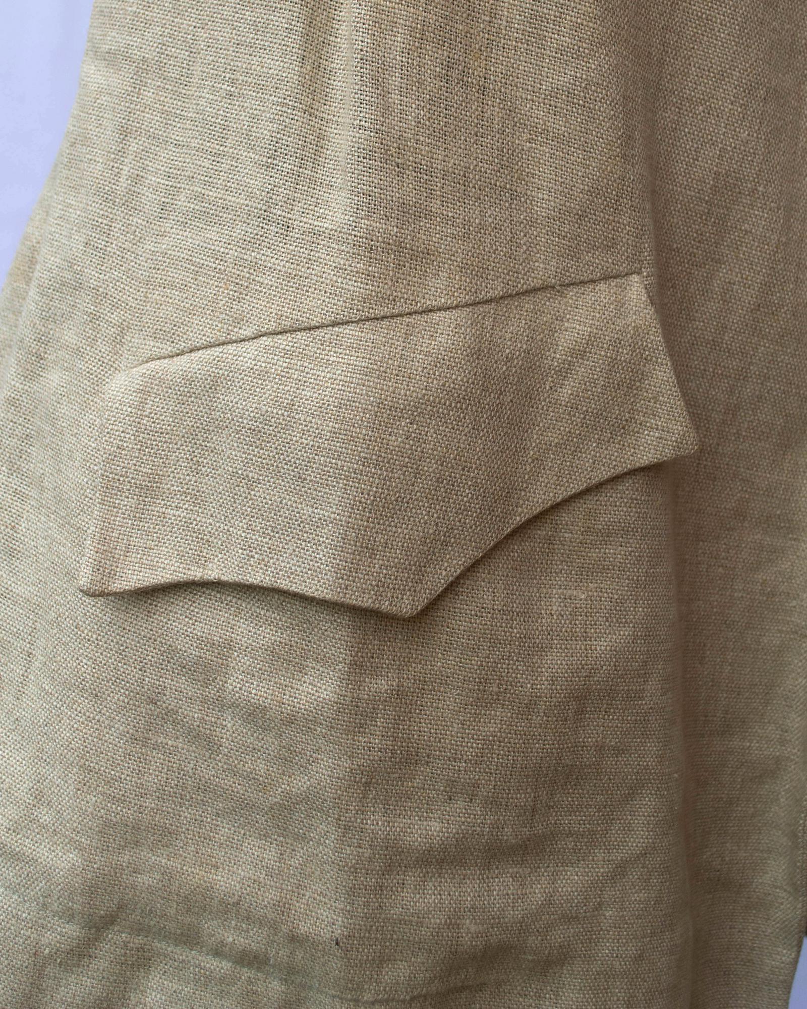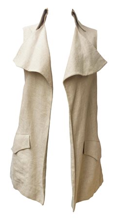 Long semi-lined waistcoat made of natural color linen, pockets and wide collar with reverse. Slit in the center back. It is worn unfastened and open. Made in Italy in the 90s. Size 42. Perfectly preserved.
