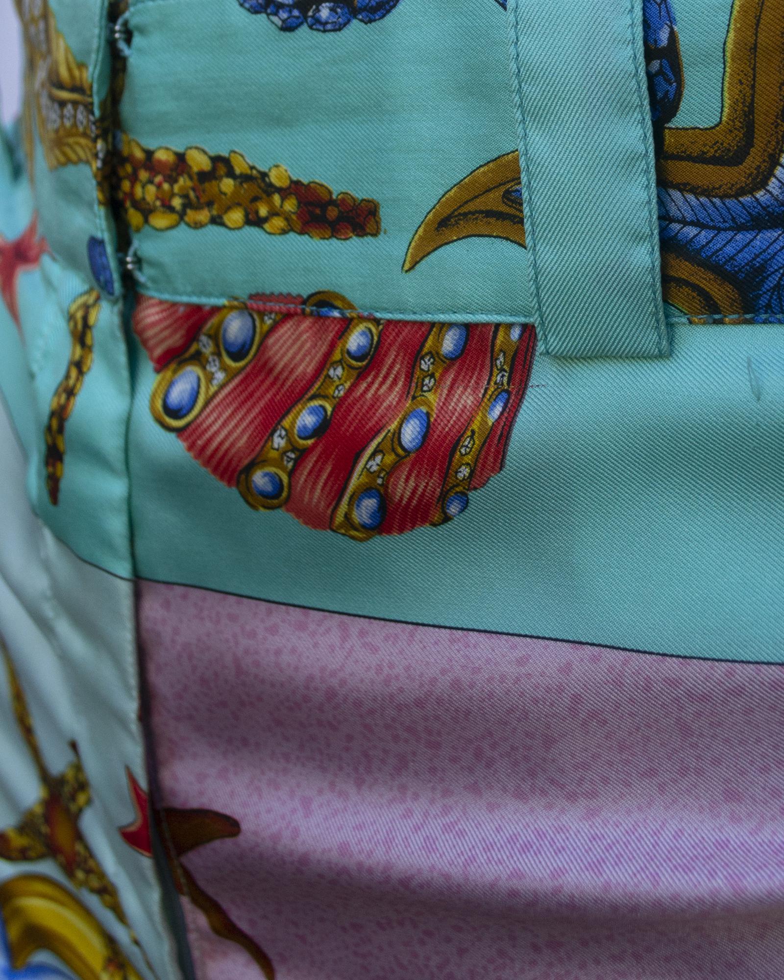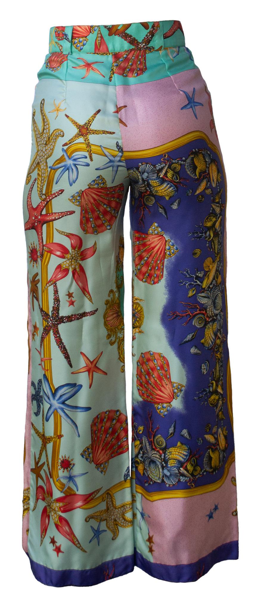 iconic sea grounds print on silk twill for this wide trouser. Opening in the center front. Made in Italy. Early 90s. Size IT 42. Well preserved.