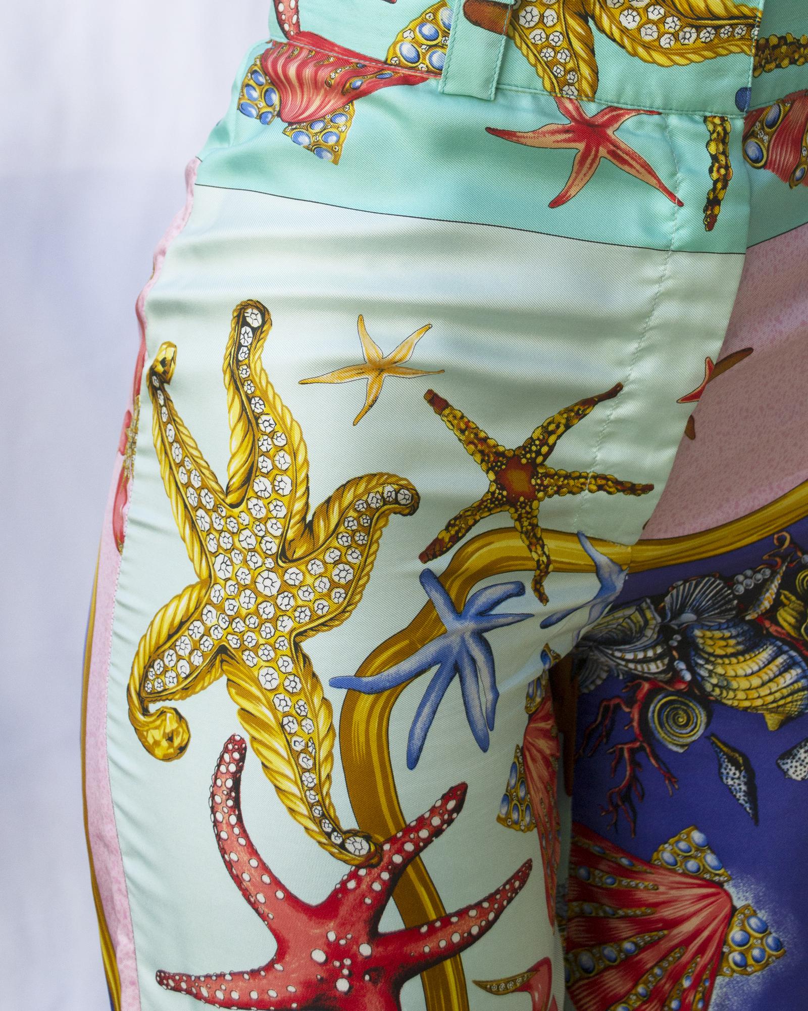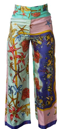 iconica stampa di motivi marini su twill di seta per questo pantalone ampio a fondo gamba. Apertura al centro davanti. Made in Italy. Primi anni '90. Taglia IT 42. Ben conservato.