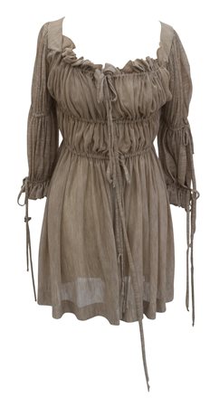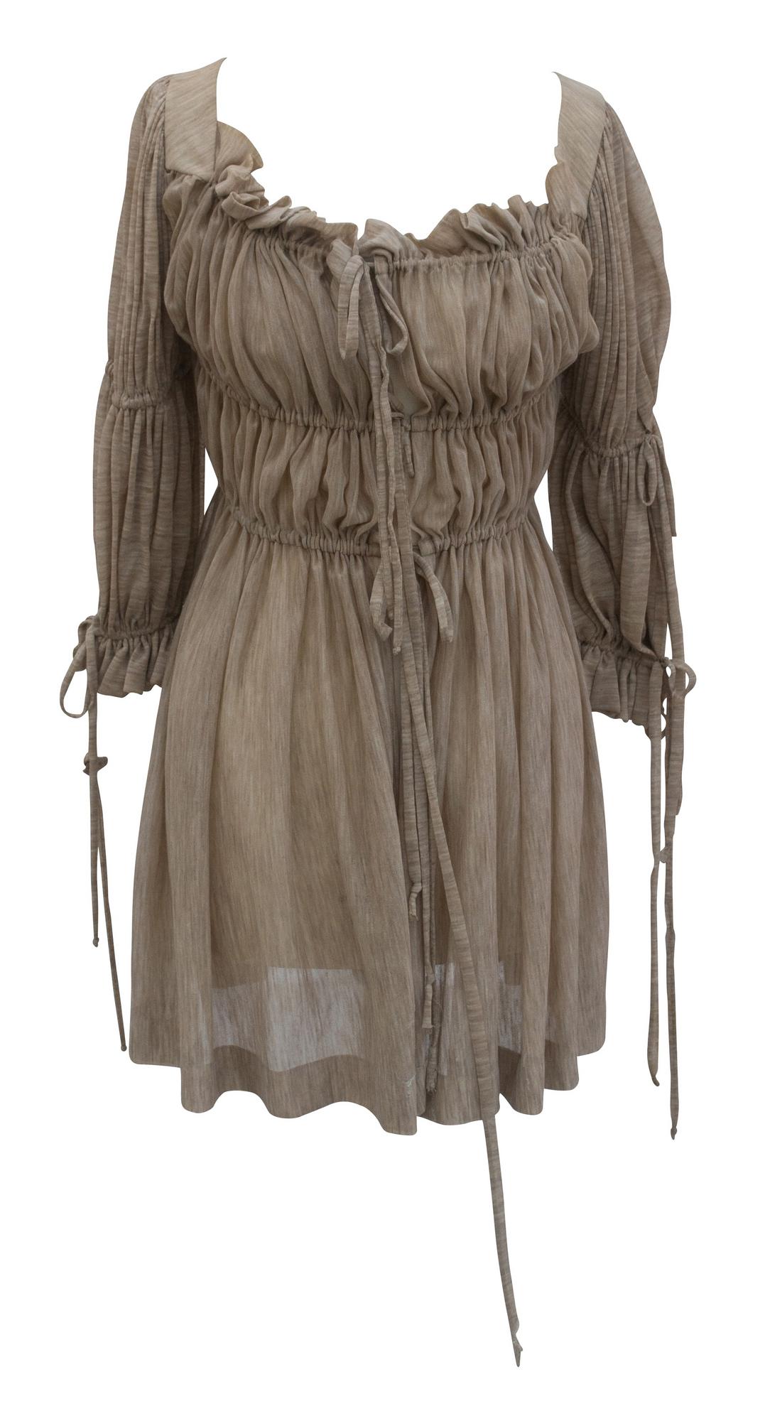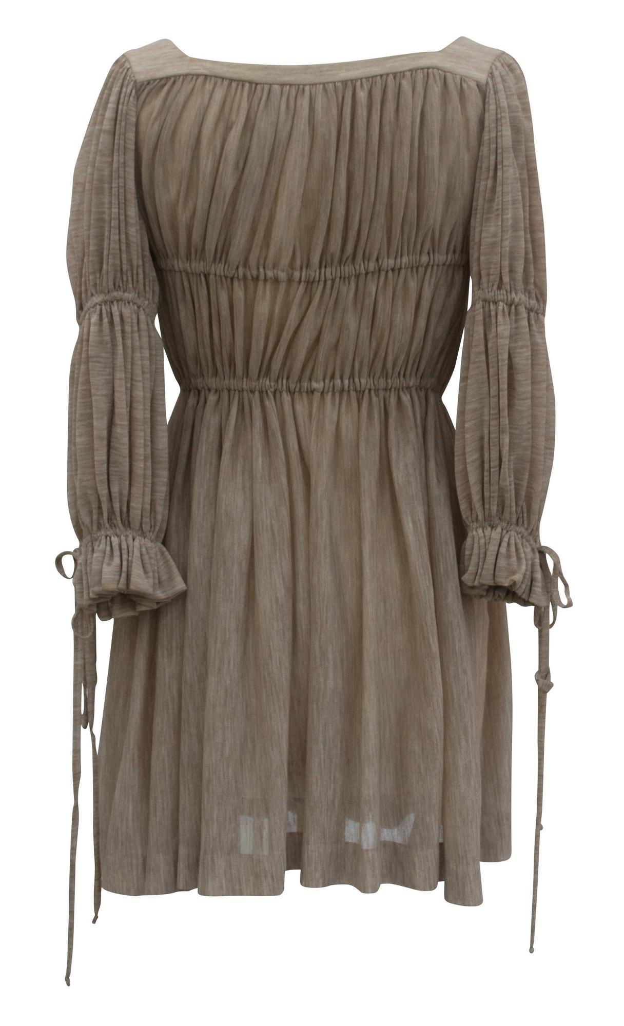 Blouse dress in fine wool beige melange jersey. The width of the sleeves and of the body is adjusted through the drawstring fastening. Uk size 10. Made in England in the 90s. Well preserved.