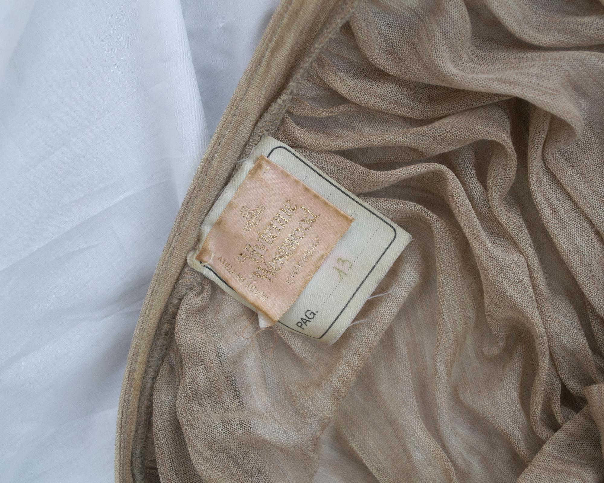 Abito blusa in jersey di lana pregiata beige melange. La larghezza delle maniche e del corpo e' regolata tramite la chiusura con coulisse. Taglia UK 10. Prodotto in Inghilterra negli anni '90. Ben conservato.