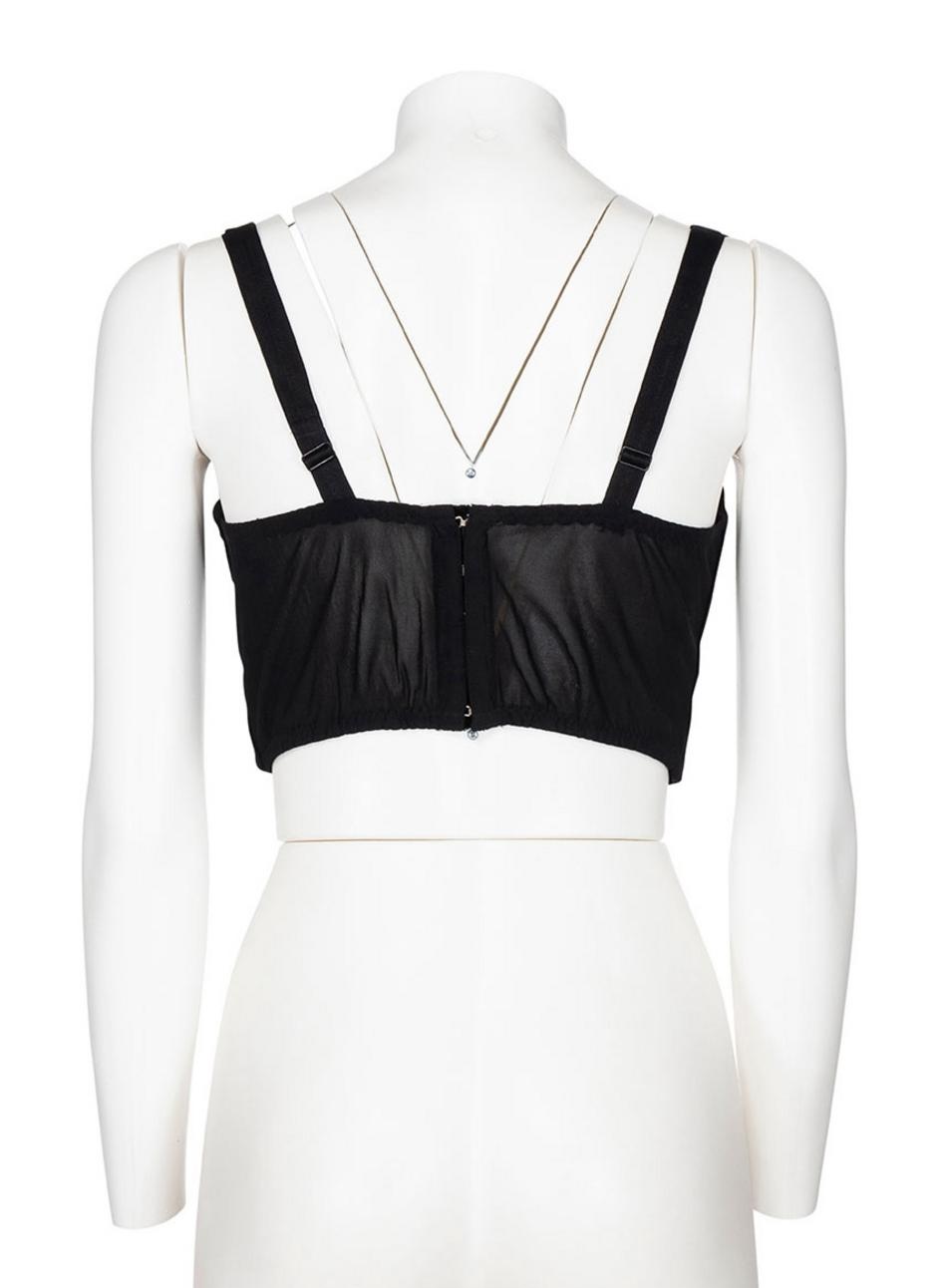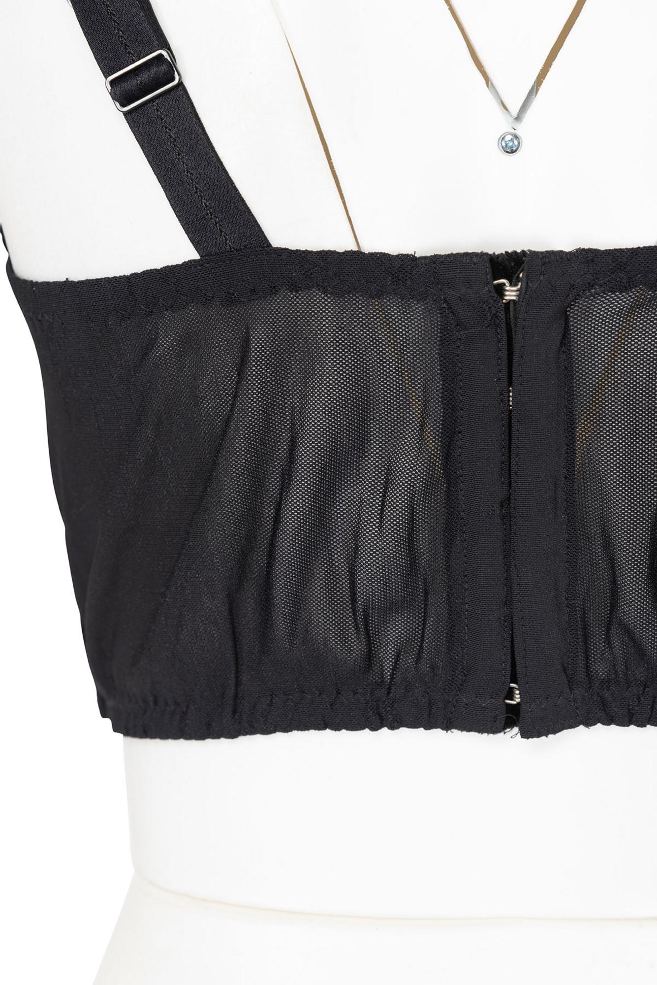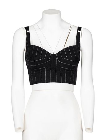 Iconic pinstripe corset with lurex from the 90's. Adjustable shoulder straps. Stretched elastic at back with hooks. 100% wool. Size is IT 46. Well Preserved, elastic at back is slightly loose.