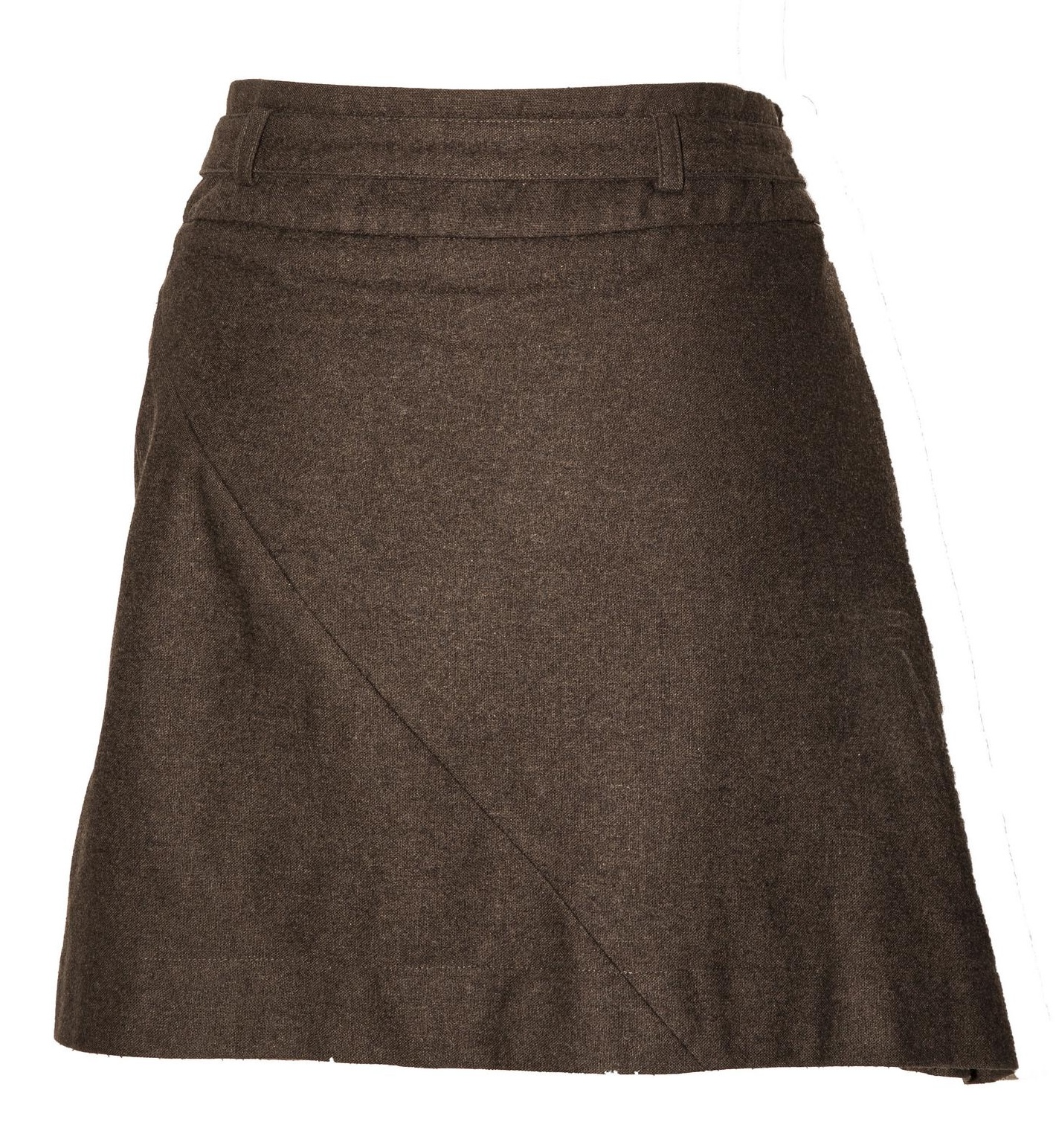 Minigonna in flanella color marrone. Le pieghe a faldone corrono solo sul davanti della gonna, cinturino in tessuto con fibbia Allacciatura laterale. Made in Italy. IT size 42. Perfettamente conservata.