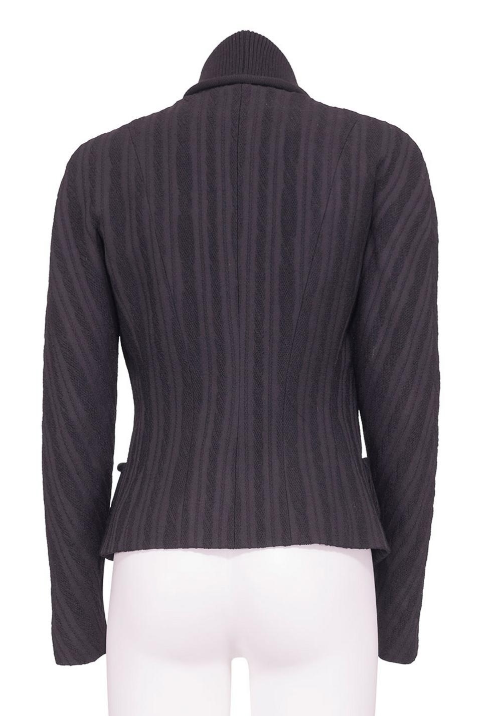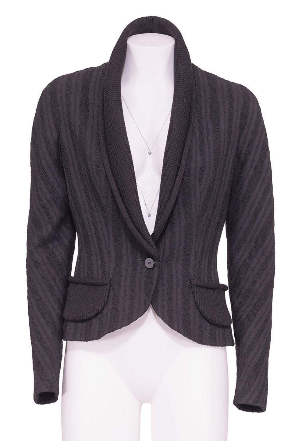 Iconica giacca con collo a scialle in maglia jacquard degli anni '90. Maniche intere senza cucitura. Completamente foderata. 98% lana, 1% nylon, 1% elastan. Fodera 100% seta. La taglia e' una FR 36. Eccellente.