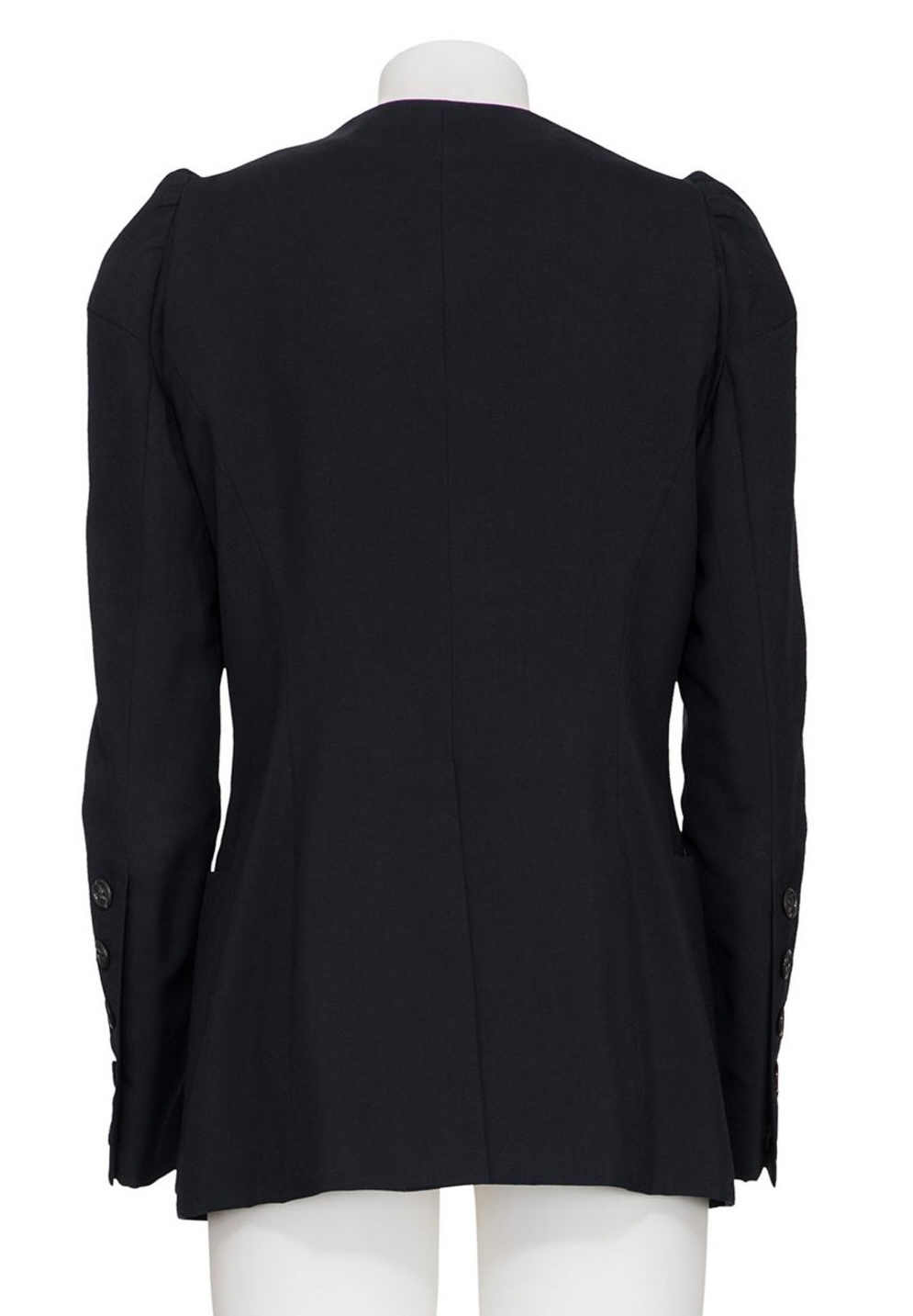 Rare and iconic collarless jacket with puffed shoulder from the 90s. Anatomical cuts. Two patch pockets. Fully lined. 55% polyester, 45% wool. Size is IT 44. Excellent condition.