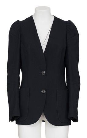 Rara e iconica giacca senza colletto con spalla a sbuffo degli anni '90. Tagli anatomici. Due tasche applicate. Completamente foderata. 55% poliestere, 45% lana. La taglia e' IT 44. Eccellente.