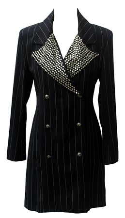 Giacca doppiopetto foderata in lana gessata. Revers completamente ricamati in swarovski. Prodotto in Italia negli anni '80. Bottoni gioiello. Taglia IT 42. Perfettamente conservata.