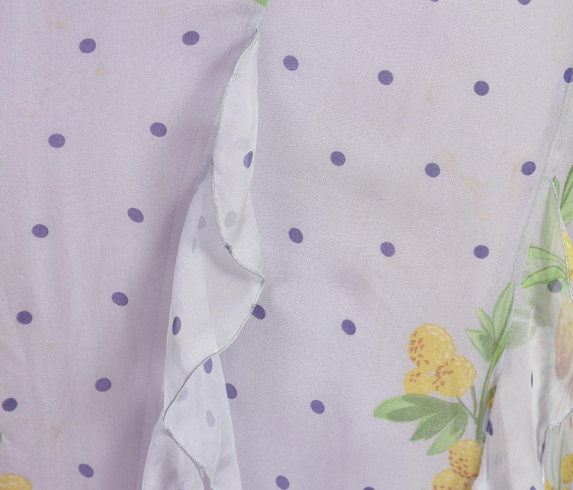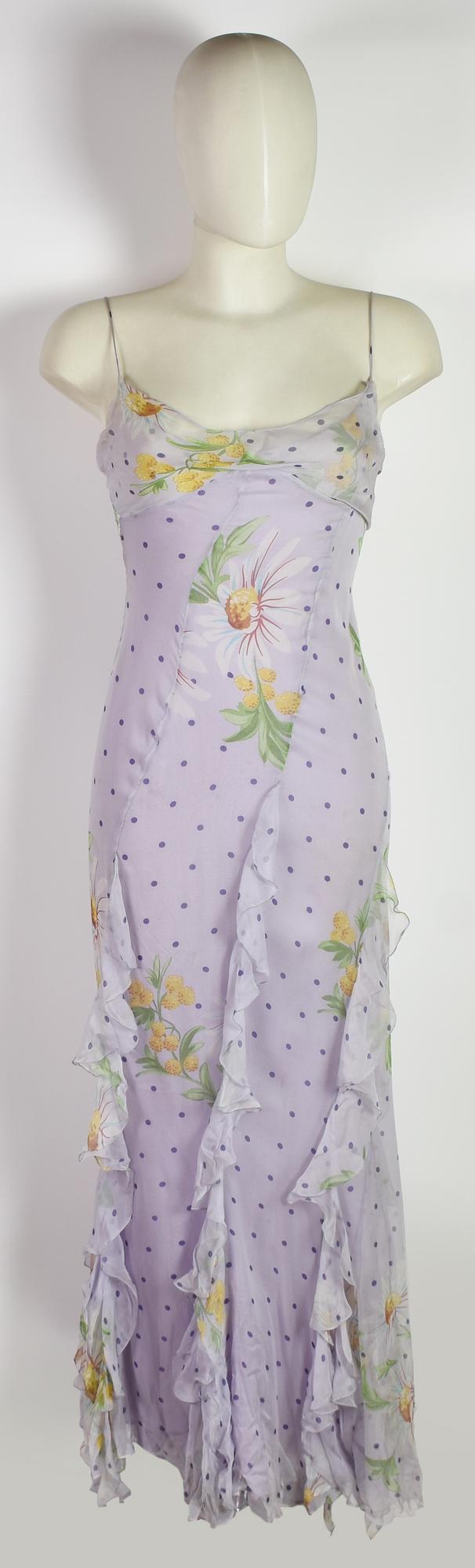 Long printed silk dress constructed with bias elements and sewn spirally. Zip closure at the back. 1990s. No size indication, probably size S. Some stains and signs of wear. Well preserved.
