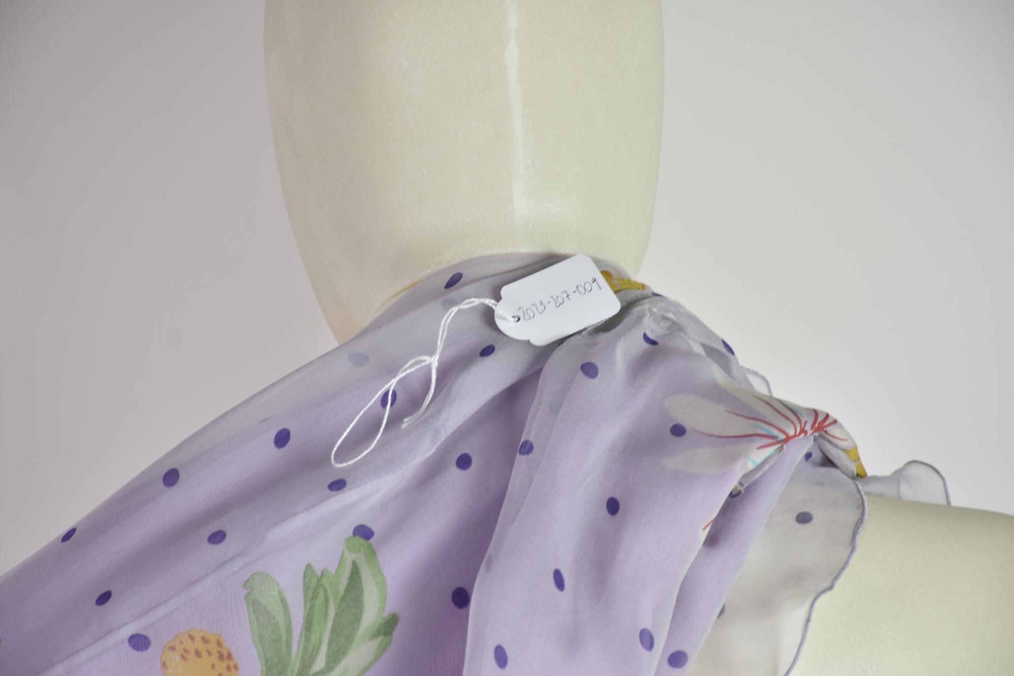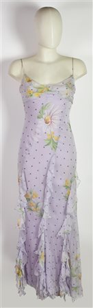Lungo abito in seta stampata costruito con elementi in sbieco e cucito a spirale. Chiusura a zip sulla schiena. Anni '90. Manca indicazione di taglia, probabilmente taglia S. Qualche macchia e segno di usura. Ben conservato.