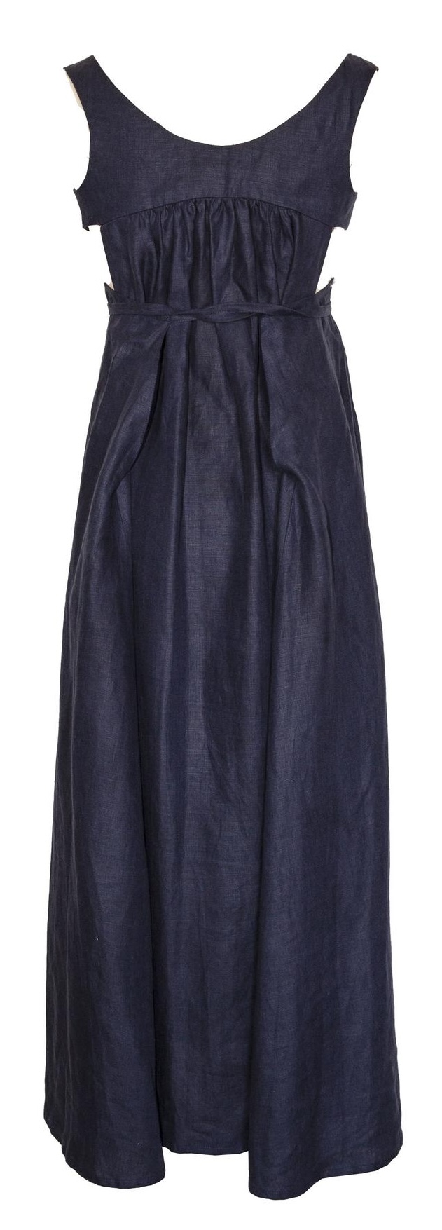 Long unlined dress in blue linen, empire cut under the bust to support the low cut bodice. Made in Italy in the 90s. Size 42. Ben conservato.