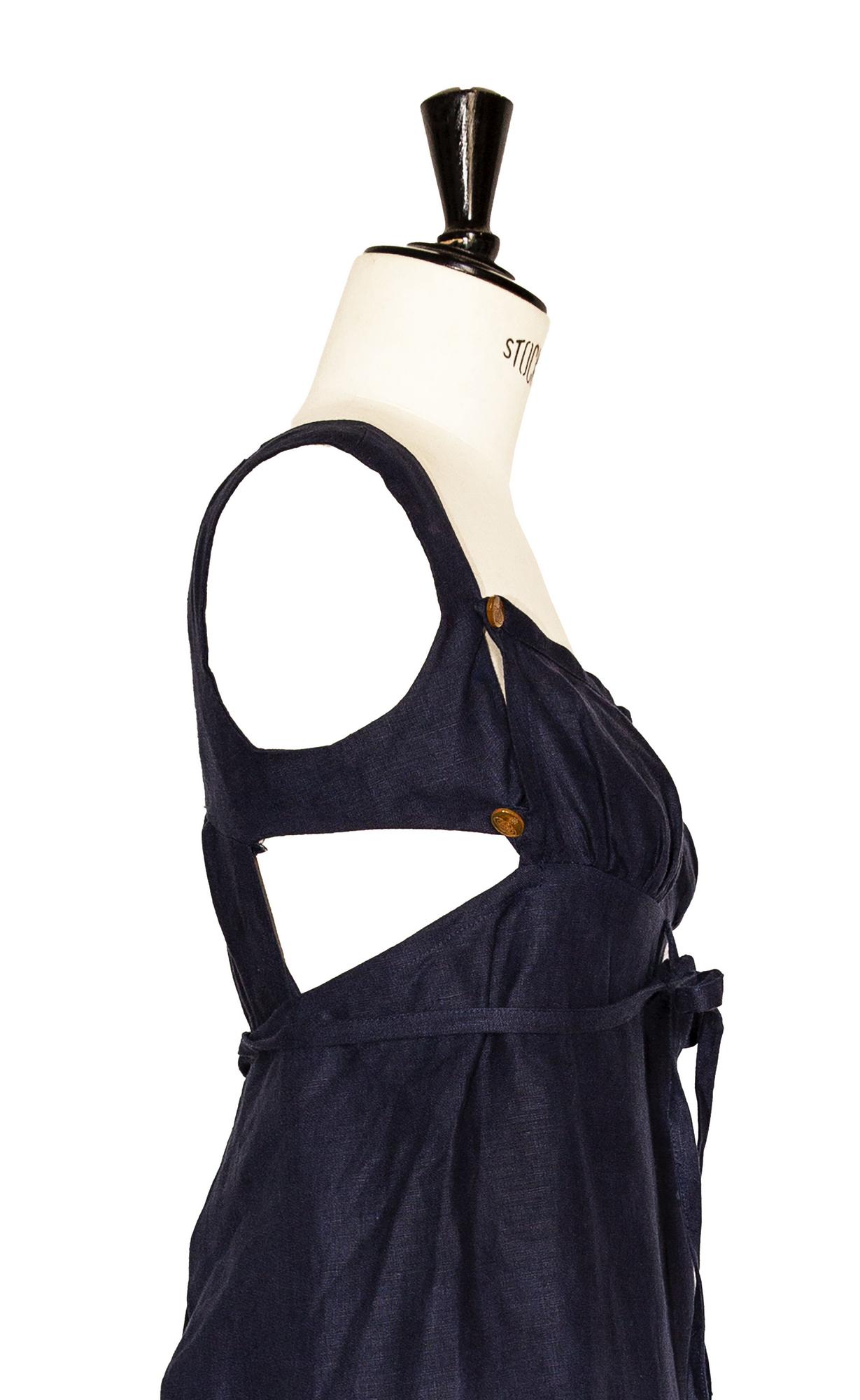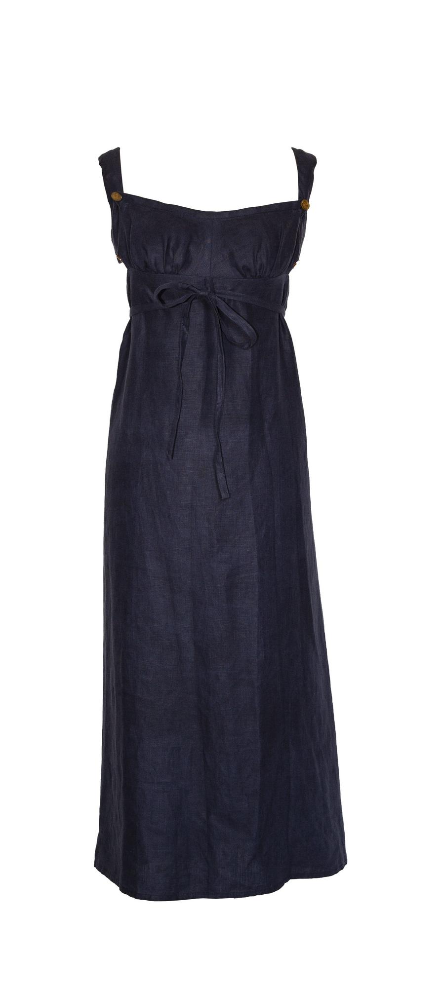 Abito sfoderato lungo in lino blu, taglio sotto il seno stile impero per sostenere il corpetto scollato. Fatto in Italia negli anni '90. Taglia 42. Ben conservato.