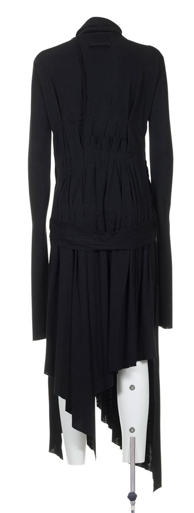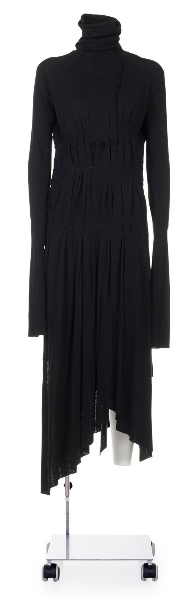 Abito lungo in jersey di lana della collezione Autunno Inverno 2002. Dolcevita e maniche extra lunghe. Pieghe cucite. Cintura sul retro. Orli asimmetrici a taglio vivo