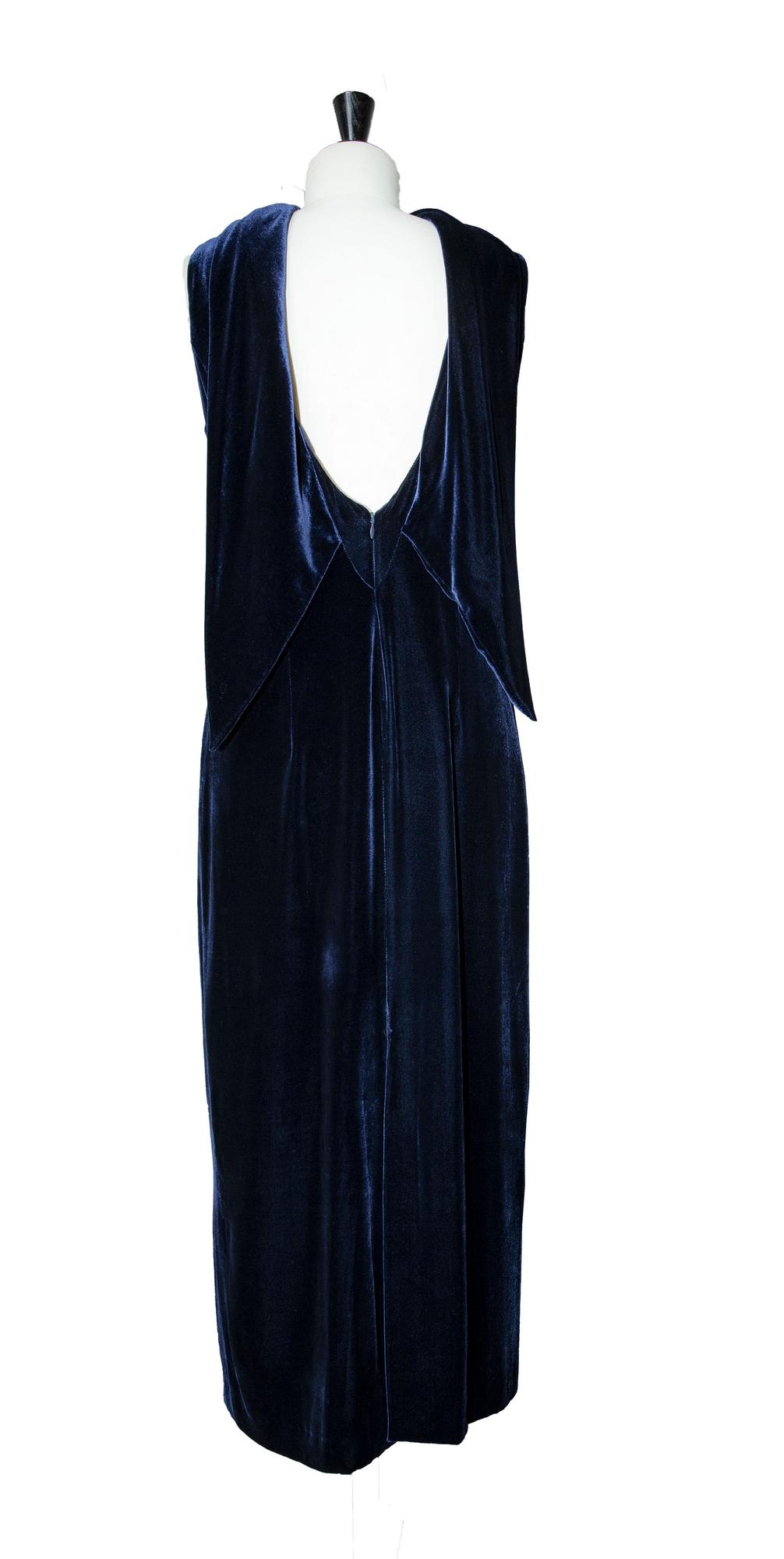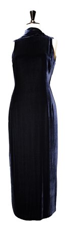 Abito in velluto panne' di viscosa e seta colore blu, taglia 42. Anno 2000. Profonda scollatura sulla schiena e scialletto che si puo' portare allacciato o slacciato. Perfettamente conservato.