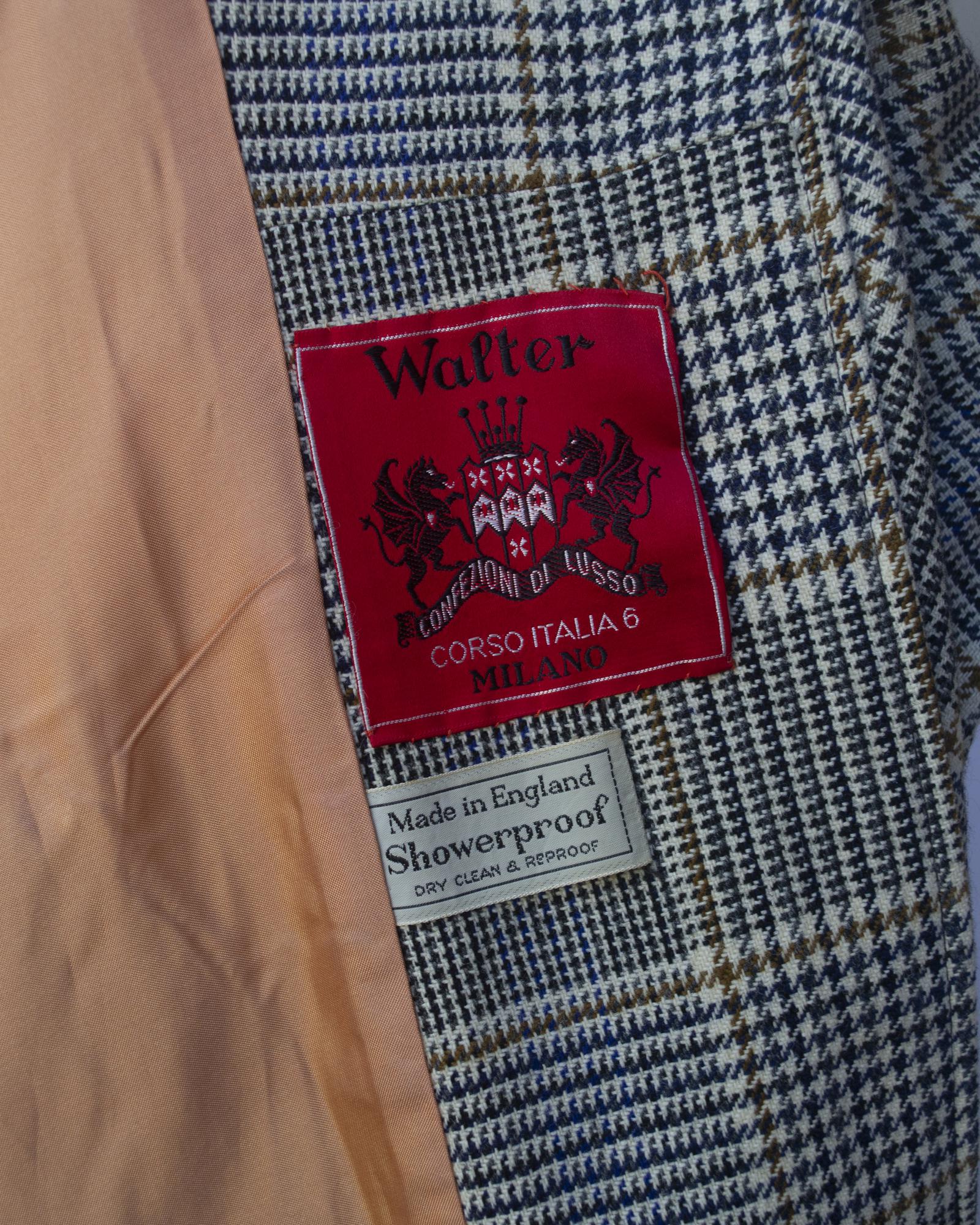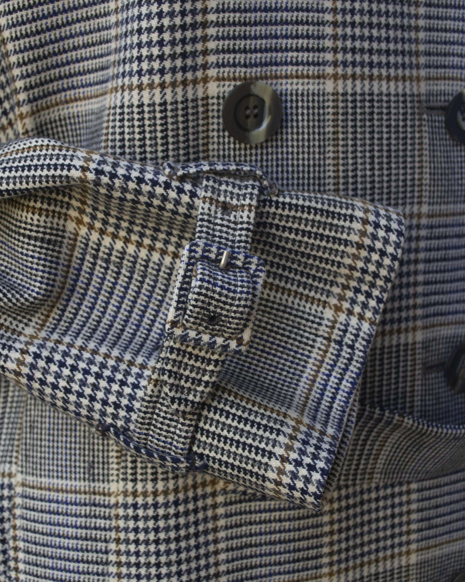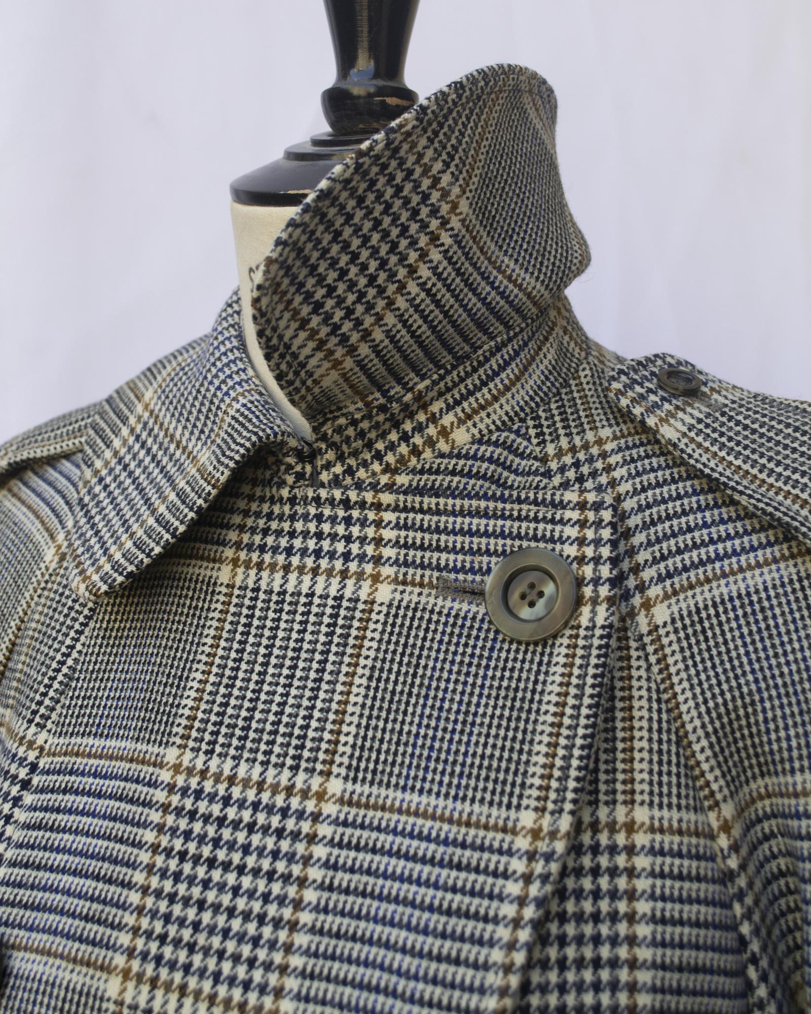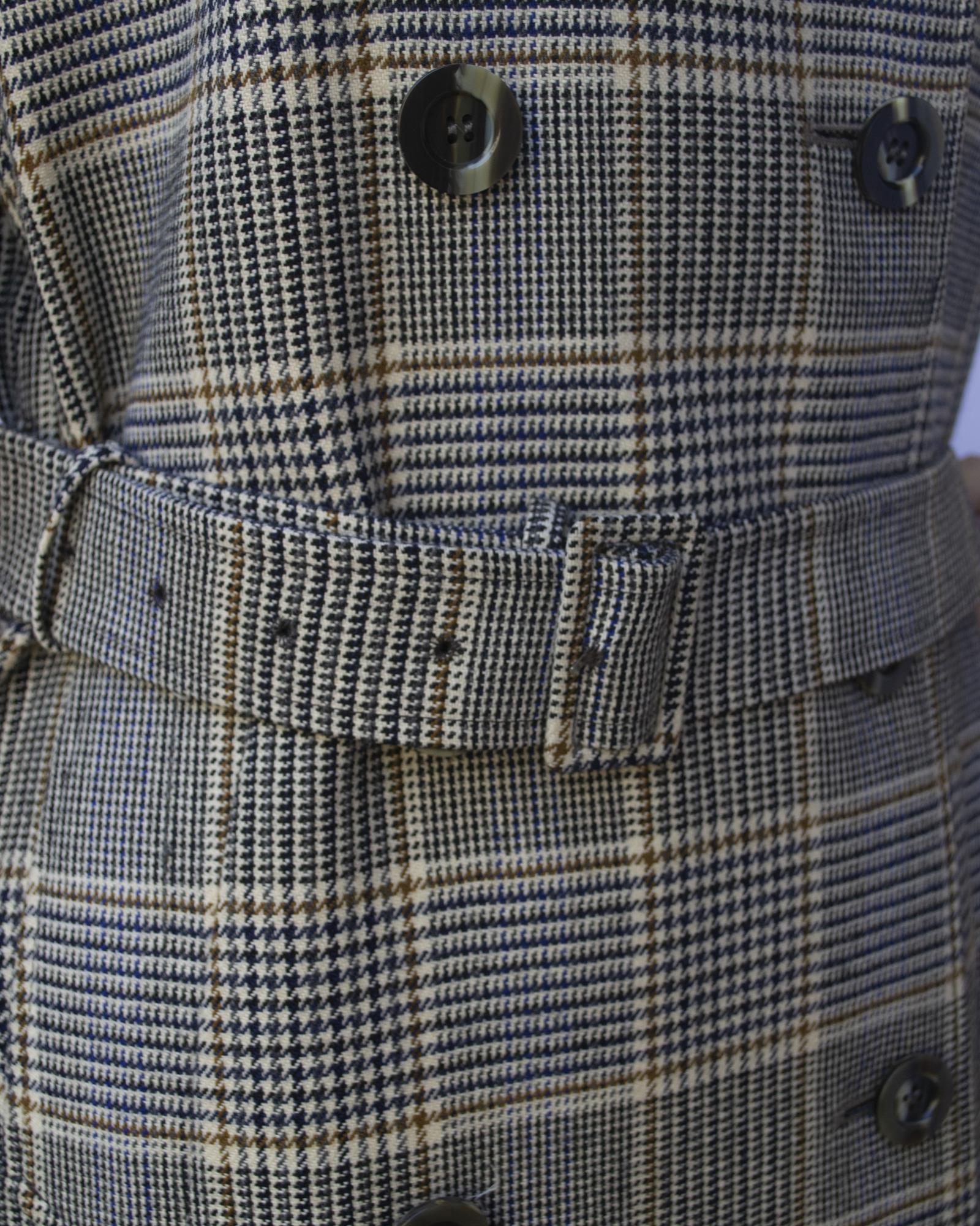 Trench coat in lana tweed in Principe di Galles nei toni del blu, vaniglia e senape. Chiusura a doppio petto con bottoni e cintura, fodera rosa salmone. Capo Vintage dei primi anni '80. Cinturini anche sui fondi delle maniche. un capo senza tempo elegante e sportivo. Perfettamente conservato.